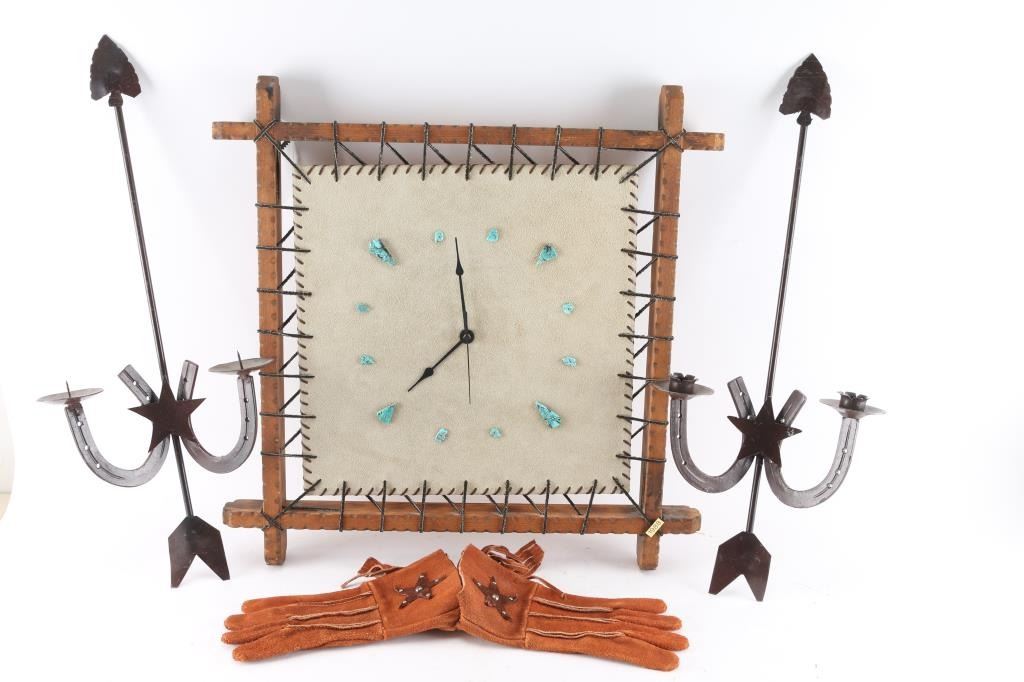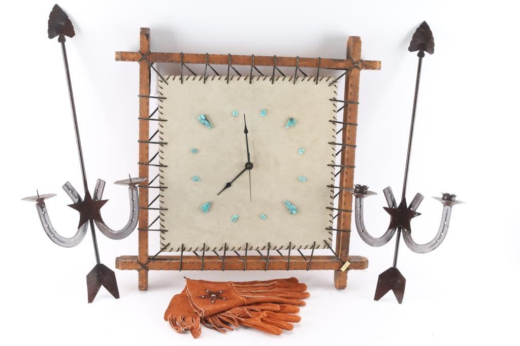 (1) Leather wall clock with turquoise nuggets for numbers and wood frame, measures 20 1/2" by 20 1/2". Battery operated, in working condition. (1) Pair of leather gauntlets. Rust colored gloves with dark brown star and metal studs. Small size. (1) Pair of metal wall sconces. Brown painted metal candlestick holders, with arrow, horseshoe, western theme.