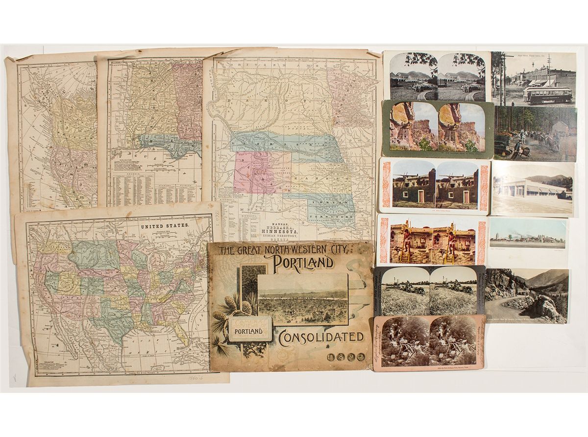 c1860 This lot consists of six stereo views, three postcards, a booklet on Portland, Oregon and three maps, c1860s of various areas of the United States. The stereo views show Moki Indians at home, cliff dwellers in Arizona, as well as scenes from Ft. Collins, Tacoma and Gold Hill. The postcards are all from the Idaho Springs area of Colorado. The four early maps show the entire country, complete with Indian Territory designations, the Southeast , North America and the Midwest from Canada to The Oklahoma Indian Territory. This is a very eclectic and historical lot. All pieces are in very nice condition. - HKA#65147