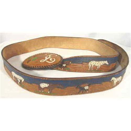 Made in 1959 for a gentleman who's first name was "Rod" and whose last name began with an "L". This belt will fit a 37" to 43" inch waist. Beautifully hand sewn and tooled in shades of blue, black white and brown , it has the name "Rod" in the center at the back and the letter "L" on the buckle which measures 4" X 3". It deoicts Horses and Foals, Cactus. Oak leaves and acorns. Very lightly worn it is a beautifull piece of western hand work.