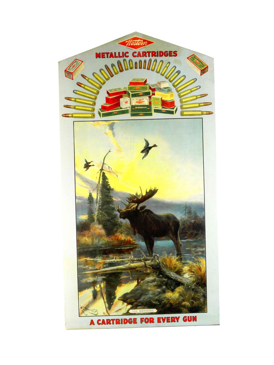 Western Metallic Cartridges Cardboard Die Cut Sign. Entitled, "The Warning". H. Edwards, artist. Depicting moose and ducks. Some minor staining probably had an easel back at one time otherwise excellent condition. 17 X 32 1/2 inches.