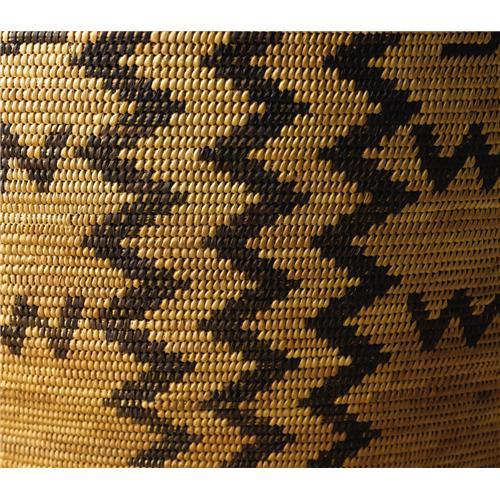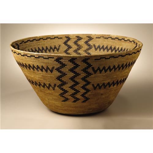 <B>Western Mono Coiled Cooking Basket</B></I><BR>Circa 1900<BR>Height 8 3/4 in. Diameter 16 3/4 in.<BR><BR>This deep bowl with wide flaring sides is decorated with a horizontal zigzag pattern interrupted by vertical zigzag bands. A narrow band of small rectangles decorates the rim. "Large bowls were used for feasts. Often acorn soup would be cooked in smaller baskets and then served in a larger bowl. Western Mono and Yokuts weaving is quite similar. There are some differences in the design used, and the Western Mono will often break the horizontal banding with vertical lines of designs. In addition, while Yokuts weavers will invariably weave a bowl on the inside face and to the right, Western Mono weavers will work on either face and in either direction."<BR><BR>Provenance<BR>Bonhams and Butterfields, Sale 7477E, Lot 3190, December 8, 2003.<BR><BR>Reference<BR>Bernstein, Bruce, <I>Native American Basketry: The Hartman Collection,</B></I> The Albrecht-Kemper Museum of Art, St. Joseph, Missouri, 1996, p. 32.<BR><BR>