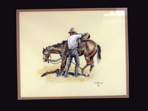 Western Pen and Ink by P.R. Sollosy, depicting cowboy putting saddle on a horse. 10 X 8 inches.