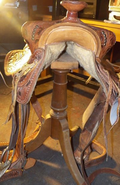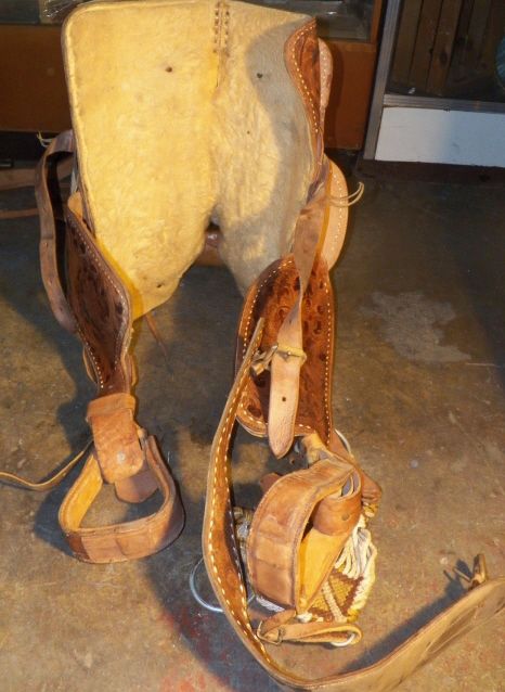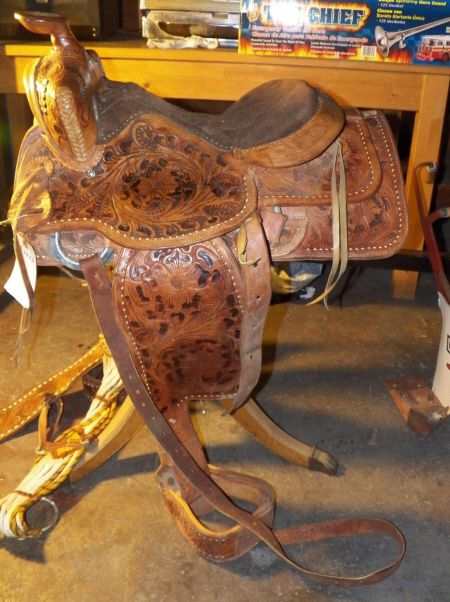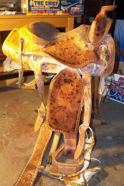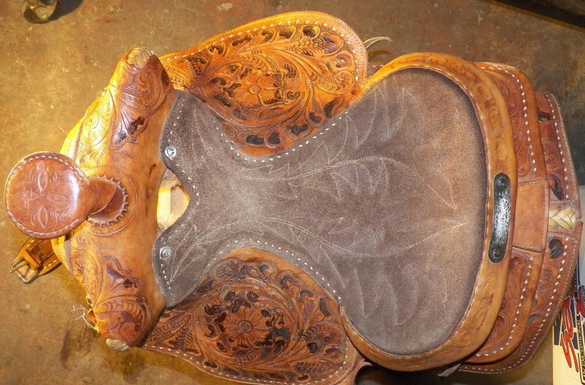 Tooled Leather 15" Seat Barrel Racing Saddle with Cushion Bottom. This saddle in used condition but very nice with quick change Stirrup adjustment, sheepskin good condition and with a silver name plate on back.