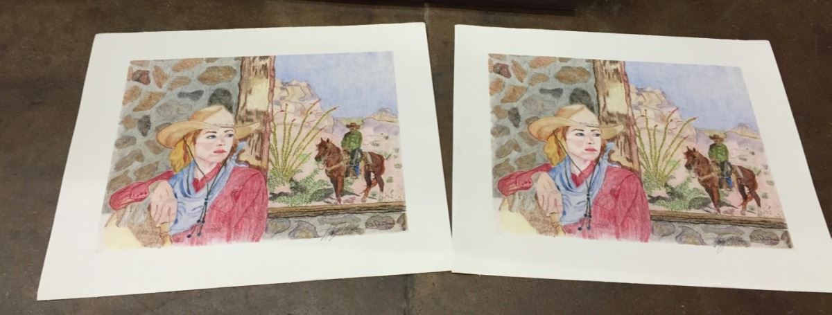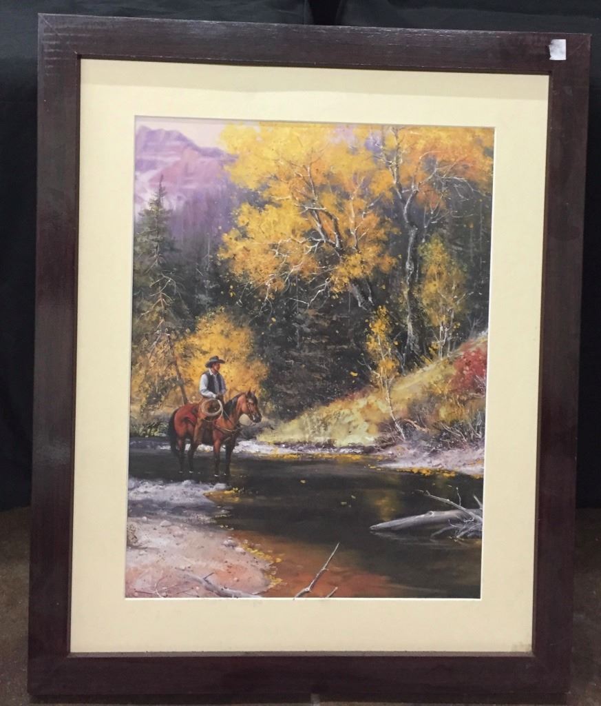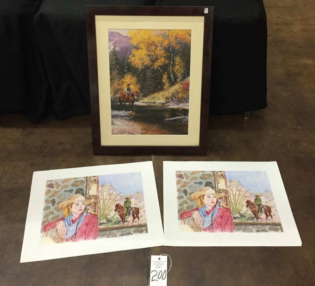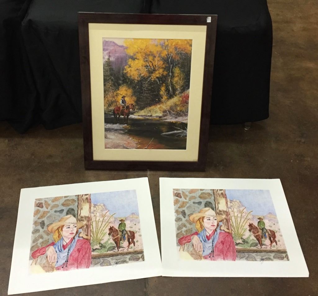 There are 3 prints in this lot. The two with the cowgirl looking out the window are signed and are on canvas. They measure 18 x 15. The framed print measures 18 x 22. Please look closely at pics - they are an important part of our description. Shipping: There will be a $7 handling / packaging fee for shipping this lot. The actual cost of postage will be added on top of that.