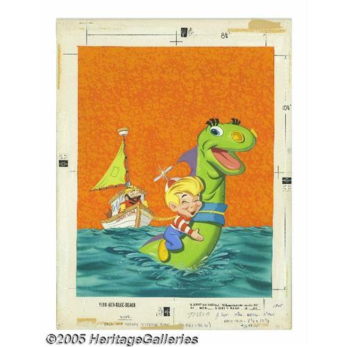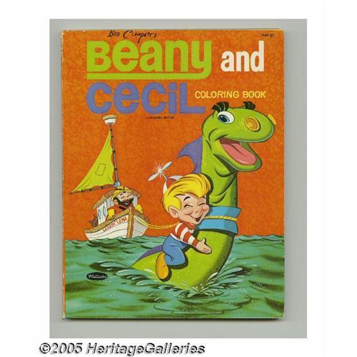 <B>Western Publishing Artist - Beany and Cecil Coloring Book Cover Original Art (Whitman, 1962).</B></I> Beany and Cecil tug Captain Huffenpuff's vessel, the Leakin' Lena, across the boundless sea, in this wet and wonderful cover illustration. Painted in watercolor on a sheet of heavy illustration board, this sparkling image is sure to leave a smile on your face! The art has an image area of 12"" x 15.5"" and is in Excellent condition. Includes a copy of " "<B>Beany and Cecil Coloring Book</B></I>. <BR><BR><B>Important notice:</B> Heritage usually auctions material at the rate of 200-250 lots per hour. On some occasions eBay Live bid software or the Internet may not be able to keep up with the pace of the auction. We recommend placing a realistic absentee bid now as insurance to avoid disappointment. Occasionally the auctioneer may eliminate or reject an eBay Live bid, and the auctioneer may also reopen a lot after the close of the eBay live bidding (usually because we missed an audience bid), and may reject your bid even if it shows you as the winning bidder. By bidding via eBay Live, you agree that Heritage may award the lot to another bidder at its sole discretion under the circumstances described above or any other reasonable circumstances. Since eBay bids are not shown to us until we open the lot on the floor, we treat those bids just like floor bids. In most cases the floor responds before the eBay bid is presented to us, due to Internet lag time, so for consistency we have made it a policy that floor bids are always considered first over tie eBay live bids. Also please note that all Heritage lots purchased through eBay Live carry a 20% Buyer's Premium. Please make sure you read the Terms and Conditions before you bid. This lot is being auctioned in conjunction with a live floor auction by Heritage Galleries & Auctioneers. All final auction and invoice information will be supplied by Heritage Galleries & Auctioneers, and all other information should be consid