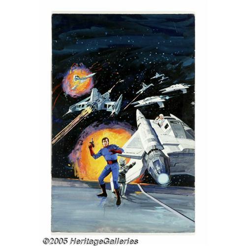 <B>Western Publishing Artist - Buck Rogers #4 Cover Original Art (Gold Key, 1979).</B></I> Buck Rogers and Twiki stand ready to fight, while Wilma Deering leads Earth's Blue Squadron in an attack against a squadron of Draconian fighters, in this stunning cover illustration. Painted in watercolor on a 20"" x 30"" sheet of heavy illustration board, the art is in Excellent condition. Includes a copy of " "<B>Buck Rogers</B></I> #4. <BR><BR><B>Important notice:</B> Heritage usually auctions material at the rate of 200-250 lots per hour. On some occasions eBay Live bid software or the Internet may not be able to keep up with the pace of the auction. We recommend placing a realistic absentee bid now as insurance to avoid disappointment. Occasionally the auctioneer may eliminate or reject an eBay Live bid, and the auctioneer may also reopen a lot after the close of the eBay live bidding (usually because we missed an audience bid), and may reject your bid even if it shows you as the winning bidder. By bidding via eBay Live, you agree that Heritage may award the lot to another bidder at its sole discretion under the circumstances described above or any other reasonable circumstances. Since eBay bids are not shown to us until we open the lot on the floor, we treat those bids just like floor bids. In most cases the floor responds before the eBay bid is presented to us, due to Internet lag time, so for consistency we have made it a policy that floor bids are always considered first over tie eBay live bids. Also please note that all Heritage lots purchased through eBay Live carry a 20% Buyer's Premium. Please make sure you read the Terms and Conditions before you bid. This lot is being auctioned in conjunction with a live floor auction by Heritage Galleries & Auctioneers. All final auction and invoice information will be supplied by Heritage Galleries & Auctioneers, and all other information should be considered preliminary. Lot:4073 <BR><BR><B>Winning Notification and Billing:
