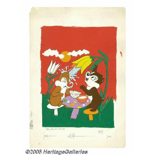 <B>Western Publishing Artist - Chip 'n' Dale #23 Cover Original Art (Gold Key, 1973).</B></I> When it rains it pours! Rodent rowdy, Chip, throws a little cold water on Dale, in this splashy cover illustration. The chipmunk pair were penciled, and inked by a Western Publishing artist, and then some enterprising painter carried this illustration a step further with watercolor! The image area measures 11"" x 15.5"" and the art is in Excellent condition. Includes a copy of " "<B>Chip 'n' Dale</B></I> #23. <BR><BR><B>Important notice:</B> Heritage usually auctions material at the rate of 200-250 lots per hour. On some occasions eBay Live bid software or the Internet may not be able to keep up with the pace of the auction. We recommend placing a realistic absentee bid now as insurance to avoid disappointment. Occasionally the auctioneer may eliminate or reject an eBay Live bid, and the auctioneer may also reopen a lot after the close of the eBay live bidding (usually because we missed an audience bid), and may reject your bid even if it shows you as the winning bidder. By bidding via eBay Live, you agree that Heritage may award the lot to another bidder at its sole discretion under the circumstances described above or any other reasonable circumstances. Since eBay bids are not shown to us until we open the lot on the floor, we treat those bids just like floor bids. In most cases the floor responds before the eBay bid is presented to us, due to Internet lag time, so for consistency we have made it a policy that floor bids are always considered first over tie eBay live bids. Also please note that all Heritage lots purchased through eBay Live carry a 20% Buyer's Premium. Please make sure you read the Terms and Conditions before you bid. This lot is being auctioned in conjunction with a live floor auction by Heritage Galleries & Auctioneers. All final auction and invoice information will be supplied by Heritage Galleries & Auctioneers, and all other information should be con