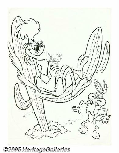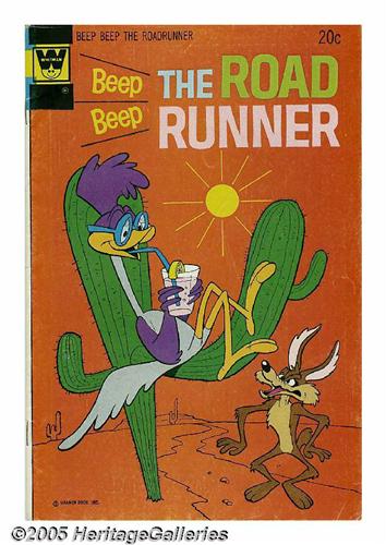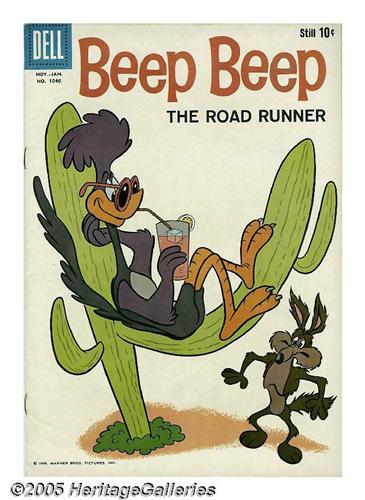 <B>Western Publishing Artist - Four Color #1046 "Beep Beep the Road Runner" Cover Original Art (Dell, 1960).</B></I> The Road Runner finds a safe spot to sip a cool drink while Wile E. Coyote glowers. This cover features crisp artwork with bold lines; the shrubbery around the base of the cactus was simplified on the published cover. A virtually identical gag (redrawn by another artist) was used thirteen years later as the cover to <B>Beep Beep The Road Runner</B></I> #39. Copies of both issues of the comic book are included in this lot. The image area of the artwork measures 10.5" x 14" and the art is in Excellent condition.