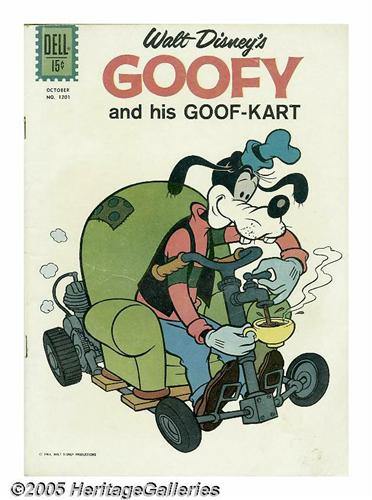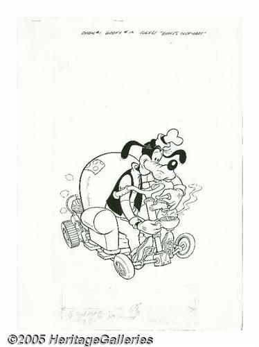 <B>Western Publishing Artist - Four Color #1201 "Goofy" Cover Original Art (Dell, 1961).</B></I> Gawrsh! Talk about the lap of luxury! Goofy takes to the road in his "Goof-Kart," a souped-up power mower, with a love seat attached, proving that one person's junk is another's personal utility vehicle. The image area measures 10" x 11" and the art is in Excellent condition.The lot includes a copy of <B>Four Color</B></I> #1201.