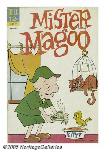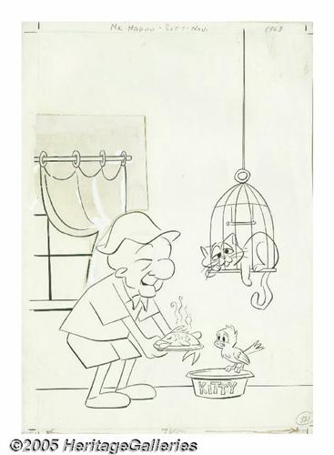 <B>Western Publishing Artist - Mr. Magoo #5 Cover Original Art (Dell, 1963).</B></I> Kitty's in the bird cage and birdy is handed a fish dinner. Oh, Magoo you've done it again! The cover image is 10.5" x 15.5", and the art is in Excellent condition. A copy of the comic is included in this lot.