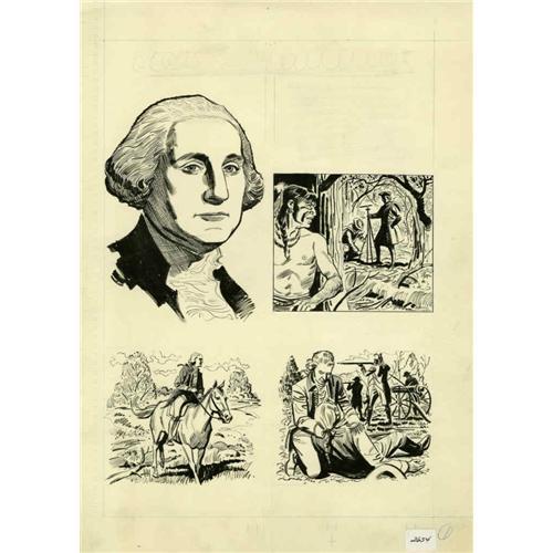 <B>Western Publishing Artist - Presidential Biography Page Original Art, Group of 108 (Western Publishing, circa 1962).</B></I> The biographies of each of the United States Presidents from George Washington to John F. Kennedy are detailed in these handsomely rendered comic book pages. The page numbers include #1-3 and 8-112 of this unidentified Western Publishing title. Since little mention is made of the Kennedy assassination, the work may have been published before 1963, or perhaps it was even shelved because of JFK's shocking death. Each page is drawn with an illustrational drybrush style and there is no type on any of the pages, only a few editorial comments written in blue pencil. All but three of the pages have an image area of approximately 12" x 16.5". The first three pages (which are about George Washington) are smaller and have an image area of 9.25" x 13". Aside from a few art corrections/pasted-on panels that have slipped loose, the art averages Very Good condition. <I>From the Random House Archives.</B></I>