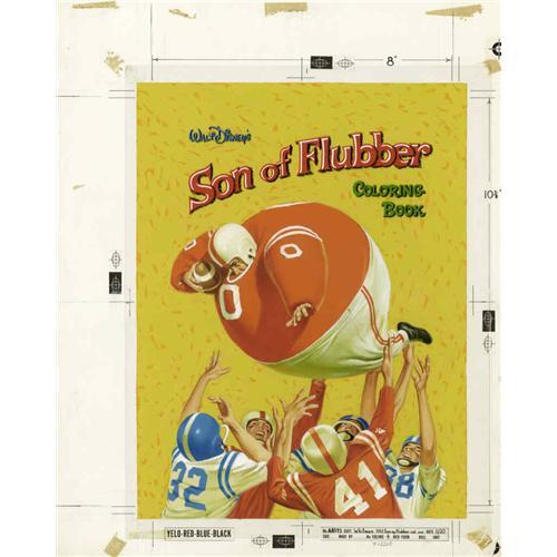 <B>Western Publishing Artist - "Son of Flubber" Coloring Book Cover Original Art (Whitman, 1963).</B></I> A Medfield College running back has a never-before-seen play -- in which he rushes past his rival's defensive linemen, and over their helmets -- in this startling and hilarious cover illustration. "Son of Flubber," a direct follow-up to Disney' 1961's film, "The Absent-Minded Professor," was the continuing story of inventor Ned Brainard, and his concoction, flubber, a gravity-defying goo that makes objects float. This hand-painted image was created in brilliant watercolor on heavy illustration board. The title type is hand-painted on a separate acetate overlay, and included with the art. The art has an image area of 11.5" x 15", and the condition is Excellent.