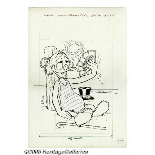 <B>Western Publishing Artist - Uncle Scrooge #156 Cover Original Art (Gold Key, 1978).</B></I> There's nothing like a few cool Benjamins to take some of the heat off a hot summer day! Uncle Scrooge puts his money to good use in this cheerful cover illustration. The image area measures 10"" x 13"" and the art is in Excellent condition. <I>From the Random House Archives</B></I>. <BR><BR><B>Important notice:</B> Heritage usually auctions material at the rate of 200-250 lots per hour. On some occasions eBay Live bid software or the Internet may not be able to keep up with the pace of the auction. We recommend placing a realistic absentee bid now as insurance to avoid disappointment. Occasionally the auctioneer may eliminate or reject an eBay Live bid, and the auctioneer may also reopen a lot after the close of the eBay live bidding (usually because we missed an audience bid), and may reject your bid even if it shows you as the winning bidder. By bidding via eBay Live, you agree that Heritage may award the lot to another bidder at its sole discretion under the circumstances described above or any other reasonable circumstances. Since eBay bids are not shown to us until we open the lot on the floor, we treat those bids just like floor bids. In most cases the floor responds before the eBay bid is presented to us, due to Internet lag time, so for consistency we have made it a policy that floor bids are always considered first over tie eBay live bids. Also please note that all Heritage lots purchased through eBay Live carry a 20% Buyer's Premium. Please make sure you read the Terms and Conditions before you bid. This lot is being auctioned in conjunction with a live floor auction by Heritage Galleries & Auctioneers. All final auction and invoice information will be supplied by Heritage Galleries & Auctioneers, and all other information should be considered preliminary. Lot:3240 <BR><BR><B>Winning Notification and Billing:</B> After the FINAL session in this auction is comple