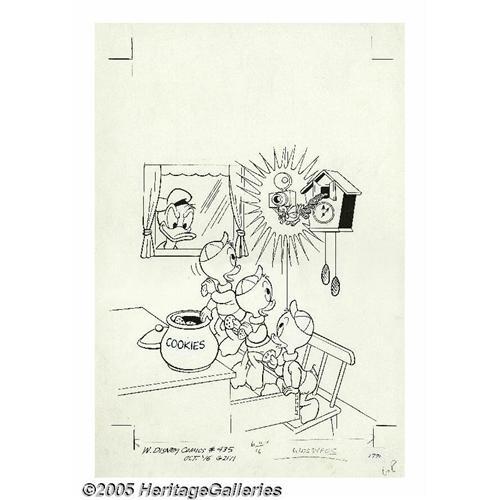 <B>Western Publishing Artist - Walt Disney Comics and Stories #435 Cover Original Art (Gold Key, 1976).</B></I> Huey, Dewey, and Louie are caught with their sticky fingers in the cookie jar, thanks to Uncle Donald's home-made security camera. The image area of this freeze-frame crime scene measures approximately 10"" x 15"", and the cover is in Excellent condition. <I>From the Random House Archives</B></I>. <BR><BR><B>Important notice:</B> Heritage usually auctions material at the rate of 200-250 lots per hour. On some occasions eBay Live bid software or the Internet may not be able to keep up with the pace of the auction. We recommend placing a realistic absentee bid now as insurance to avoid disappointment. Occasionally the auctioneer may eliminate or reject an eBay Live bid, and the auctioneer may also reopen a lot after the close of the eBay live bidding (usually because we missed an audience bid), and may reject your bid even if it shows you as the winning bidder. By bidding via eBay Live, you agree that Heritage may award the lot to another bidder at its sole discretion under the circumstances described above or any other reasonable circumstances. Since eBay bids are not shown to us until we open the lot on the floor, we treat those bids just like floor bids. In most cases the floor responds before the eBay bid is presented to us, due to Internet lag time, so for consistency we have made it a policy that floor bids are always considered first over tie eBay live bids. Also please note that all Heritage lots purchased through eBay Live carry a 20% Buyer's Premium. Please make sure you read the Terms and Conditions before you bid. This lot is being auctioned in conjunction with a live floor auction by Heritage Galleries & Auctioneers. All final auction and invoice information will be supplied by Heritage Galleries & Auctioneers, and all other information should be considered preliminary. Lot:3259 <BR><BR><B>Winning Notification and Billing:</B> After the FINAL se