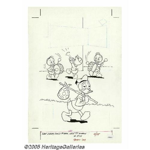 <B>Western Publishing Artist - Walt Disney Comics and Stories #444 Cover Original Art (Gold Key, 1977).</B></I> A sleepy-eyed Donald Duck is forced to run away from home in order to get some relief from the boisterous marching band of Huey, Dewey, and Louie. The image area of this whooping hoedown measures approximately 10"" x 15"", and the art is in Excellent condition. <I>From the Random House Archives</B></I>. <BR><BR><B>Important notice:</B> Heritage usually auctions material at the rate of 200-250 lots per hour. On some occasions eBay Live bid software or the Internet may not be able to keep up with the pace of the auction. We recommend placing a realistic absentee bid now as insurance to avoid disappointment. Occasionally the auctioneer may eliminate or reject an eBay Live bid, and the auctioneer may also reopen a lot after the close of the eBay live bidding (usually because we missed an audience bid), and may reject your bid even if it shows you as the winning bidder. By bidding via eBay Live, you agree that Heritage may award the lot to another bidder at its sole discretion under the circumstances described above or any other reasonable circumstances. Since eBay bids are not shown to us until we open the lot on the floor, we treat those bids just like floor bids. In most cases the floor responds before the eBay bid is presented to us, due to Internet lag time, so for consistency we have made it a policy that floor bids are always considered first over tie eBay live bids. Also please note that all Heritage lots purchased through eBay Live carry a 20% Buyer's Premium. Please make sure you read the Terms and Conditions before you bid. This lot is being auctioned in conjunction with a live floor auction by Heritage Galleries & Auctioneers. All final auction and invoice information will be supplied by Heritage Galleries & Auctioneers, and all other information should be considered preliminary. Lot:3261 <BR><BR><B>Winning Notification and Billing:</B> After the FI