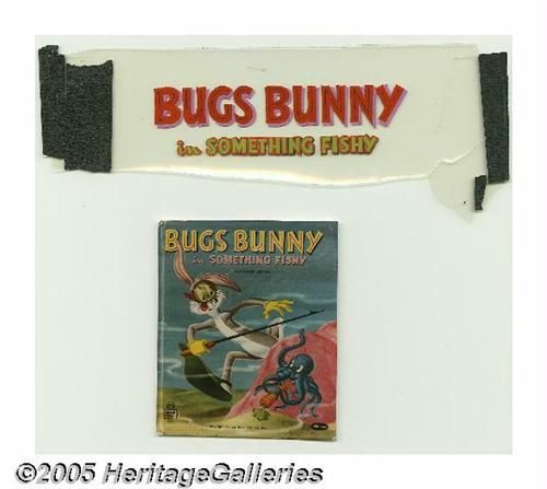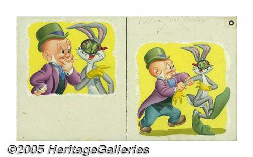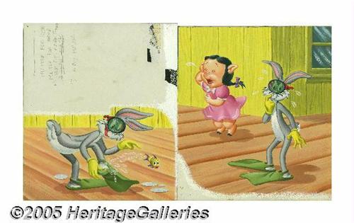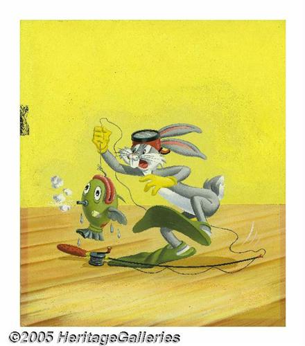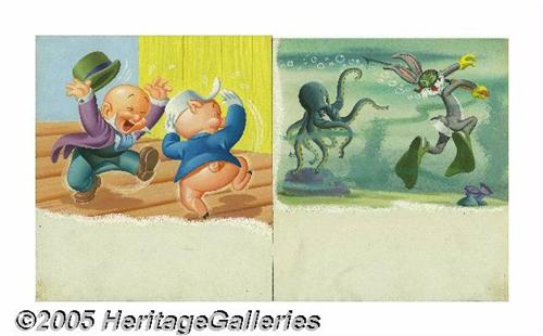 <B>Western Publishing Artist - Whitman Tell-A-Tale Bugs Bunny Illustration Original Art, Group of 7 (Whitman, 1955).</B></I>"'Eeek!' Petunia shrieked and pointed over the side of the fishing boat. 'Wh-wh-what is it?' stammered Porky. 'A weal monster!' Elmer gasped." Bugs Bunny encounters a playful octopus in this lot of seven acrylic on board paintings from <B>Bugs Bunny in Something Fishy</B></I>. Elmer Fudd, Petunia Pig, and Porky Pig all appear. The image areas range from 8.5" x 4.5" to 8.5" x 10", and the art is in Excellent condition.