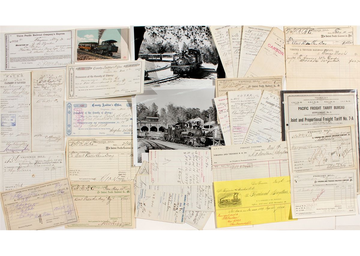 1879 75 Documents: Idaho Central Ray (1), Central Pacific (2) 1870s , Union Pacific (1) 1870s, Oregon Shortline (1), Tonopah & Goldfield (1), Silver City, Deming & Pacific (1), Virginia & Truckee (17), Nevada County Naroow Guage (1), Nevada Northern (1), SF Municipal Ray (50), plus 2 others. Lynn Langdon Collection - HKA#65677