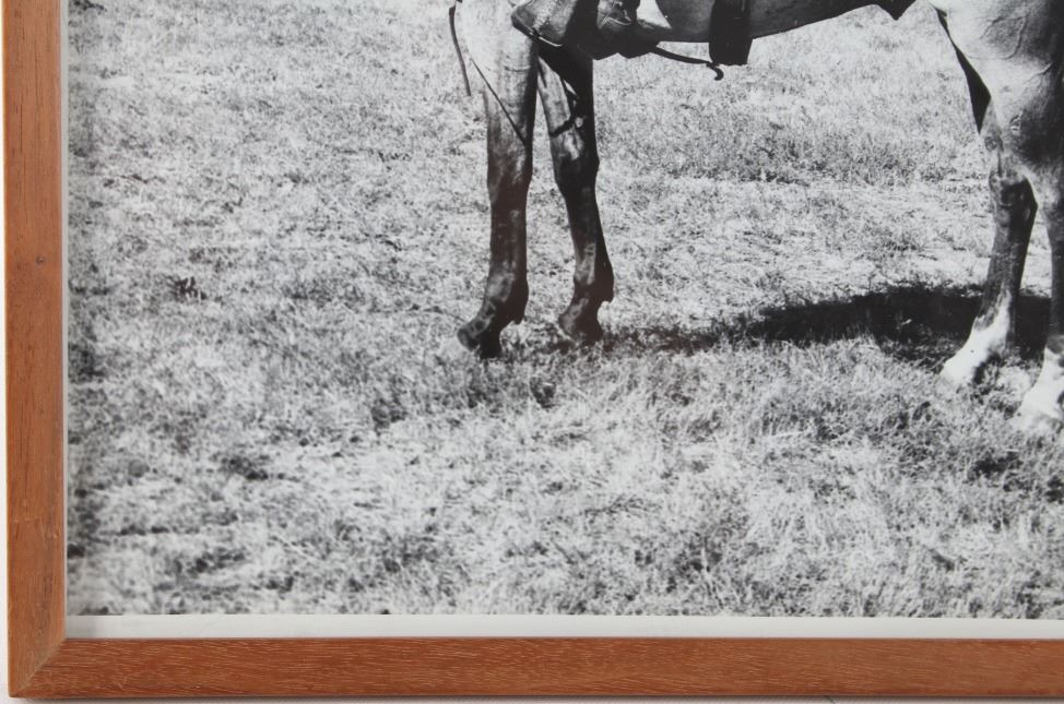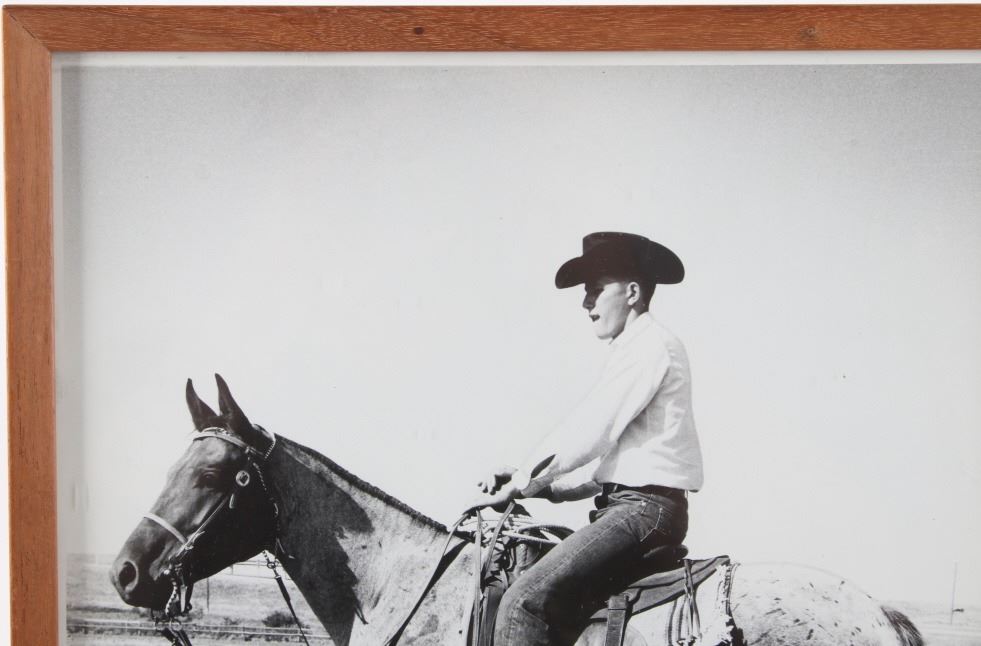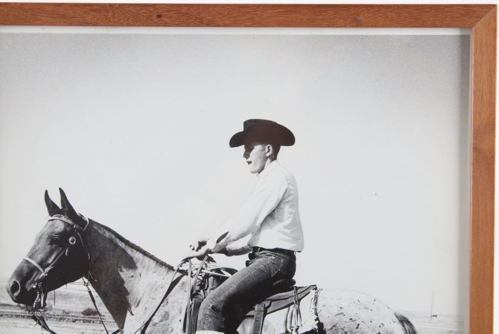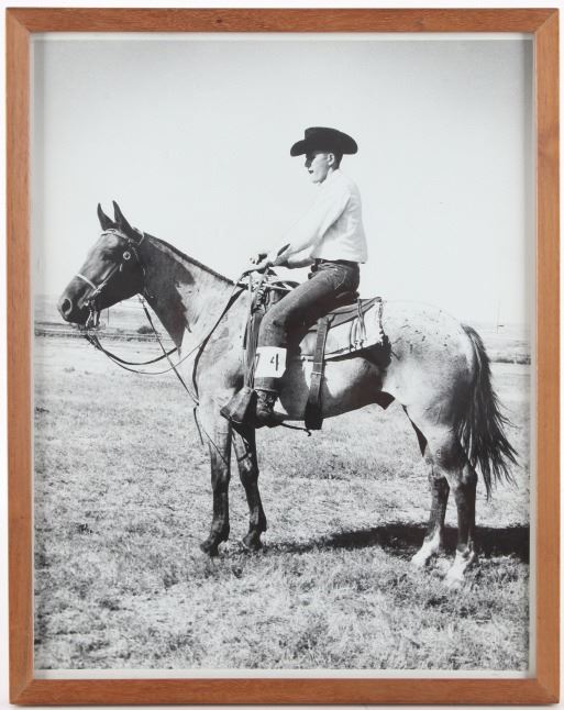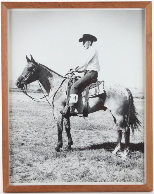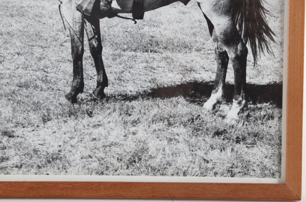Featured in this lot is this western rodeo contender gelatin silver photograph, circa 1960's. The photograph features a picture of a roper with the tag number 74 on his left leg and rope hung on the horn of his saddle, looking down at his horse’s head. The condition of this framed gelatin silver is good, with no obvious signs of damage to the photograph or the frame. The measurements of this framed photograph are 14 3/4" x 11 5/8" and the visible art measures 13 3/4" x 10 5/8".
