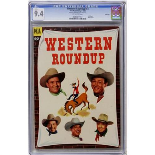 <B>Western Roundup #3 File Copy (Dell, 1953) CGC NM 9.4 Off-white pages.</B></I> Dell Giant. Photo cover. Highest grade yet assigned by CGC for this issue. CGC notes, "From the Random House Archives." Overstreet 2007 NM- 9.2 value = $220. CGC census 7/07: 1 in 9.4, none higher.<BR><BR><b>Shipping:</b> Comics - Slabbed (certified) (<a target="_blank" href="http://www.heritageauctions.com/common/shipping.php">view shipping information</a>)