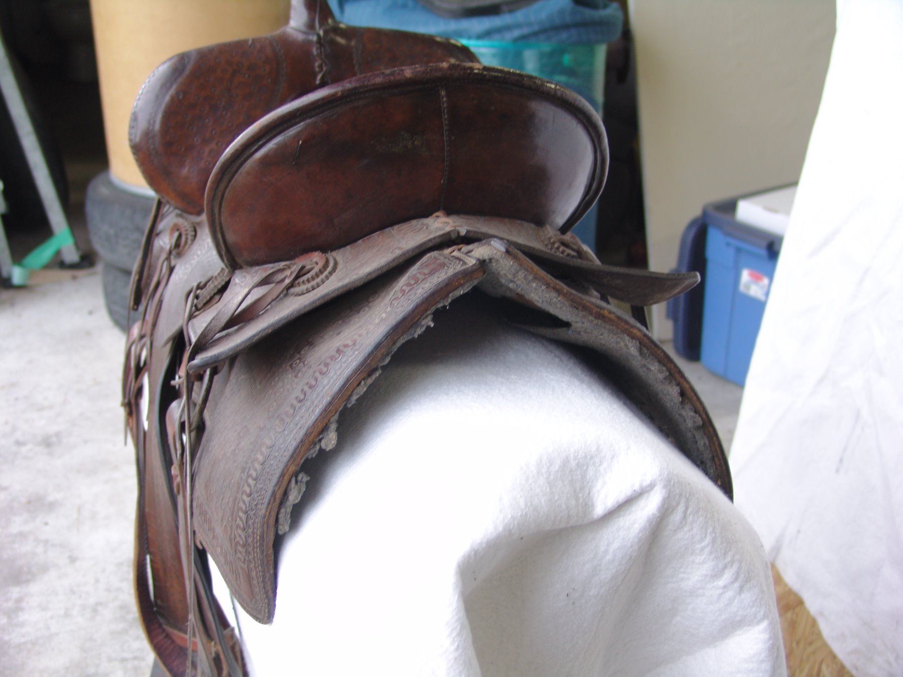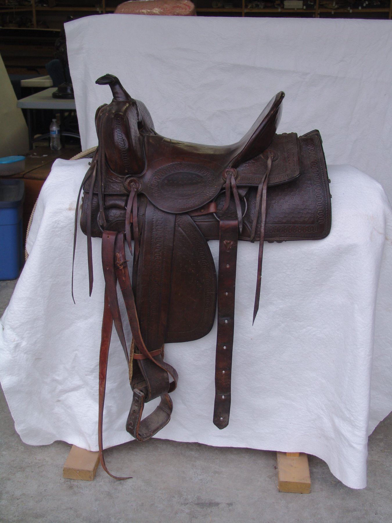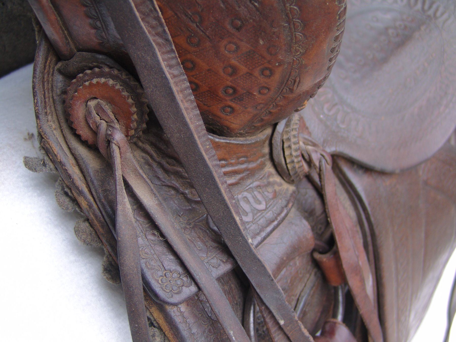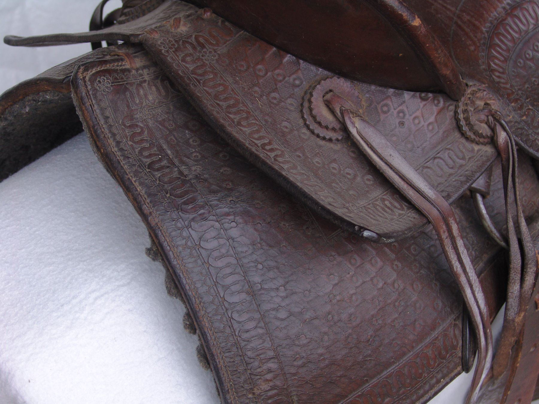 Mid/Late 1900s Adult Fully tooled, western pleasure saddle with fancy stitched pommel, square cut skirts, high cantle, and 14" saddle. Maker unknown.