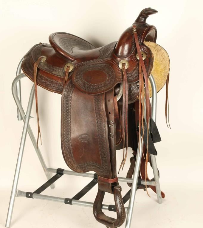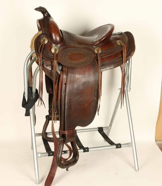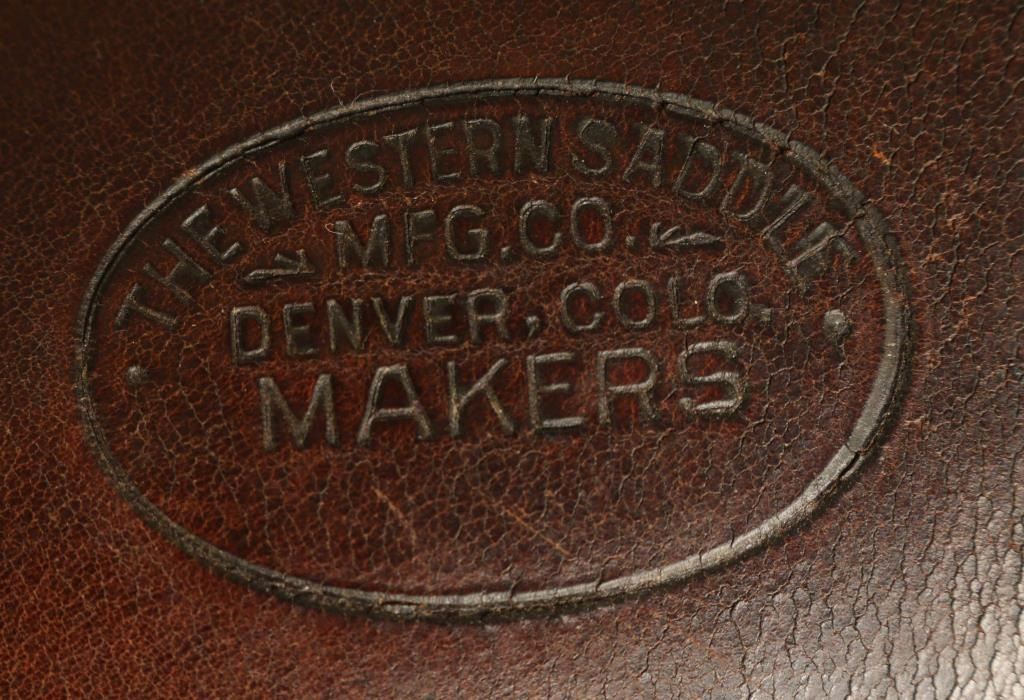 This brown saddle is maker marked " The Western Saddle MFG Co. Denver, Colorado Makers" in one spot. The saddle has a geometric stamp pattern and has nickel accents. The seat measures 12.5 inches.