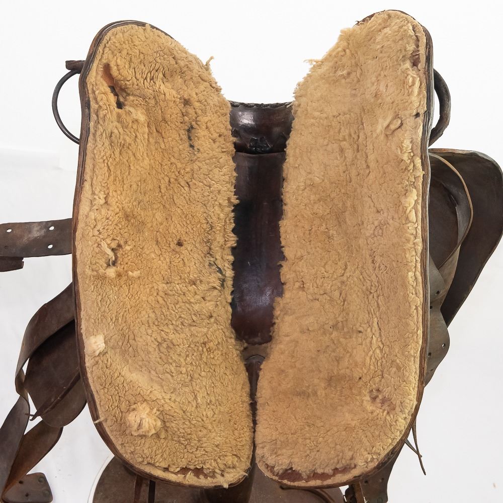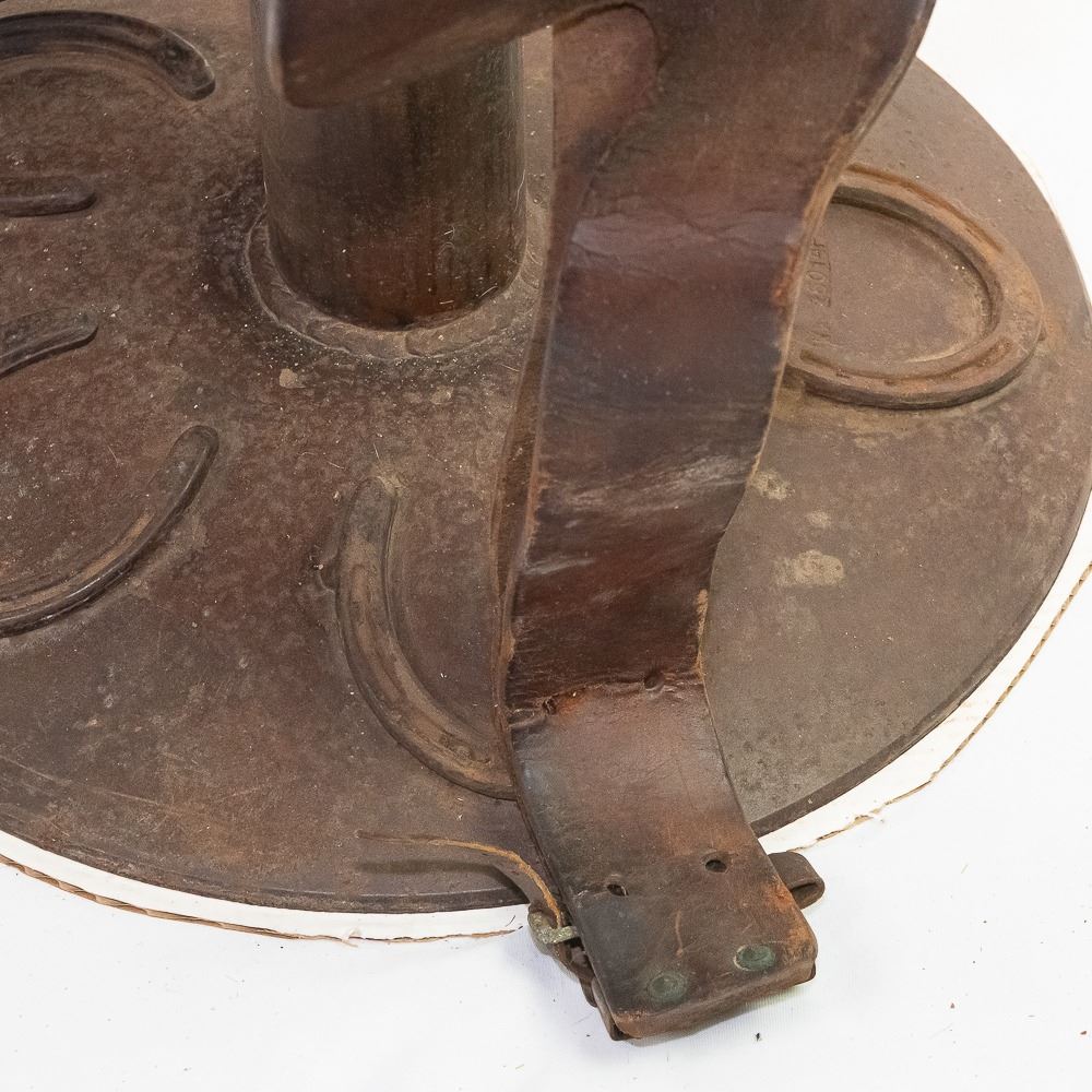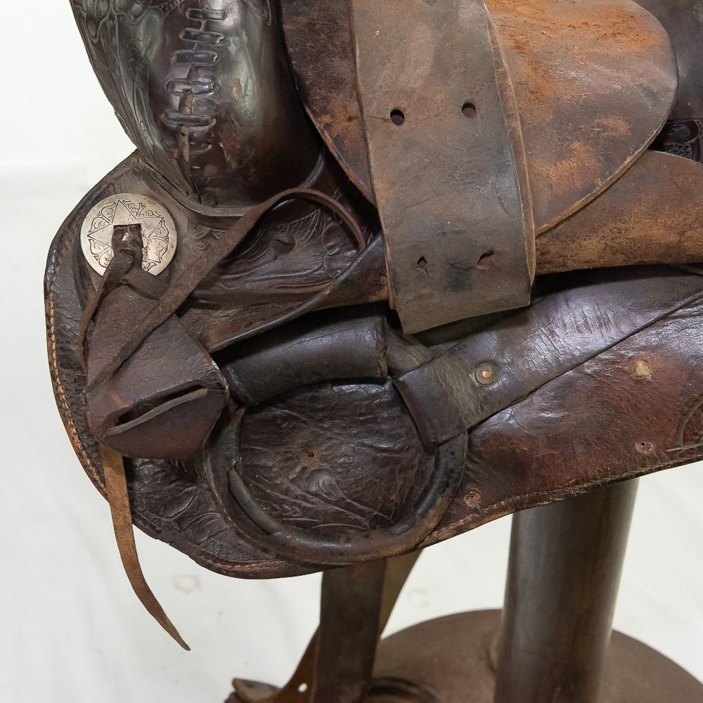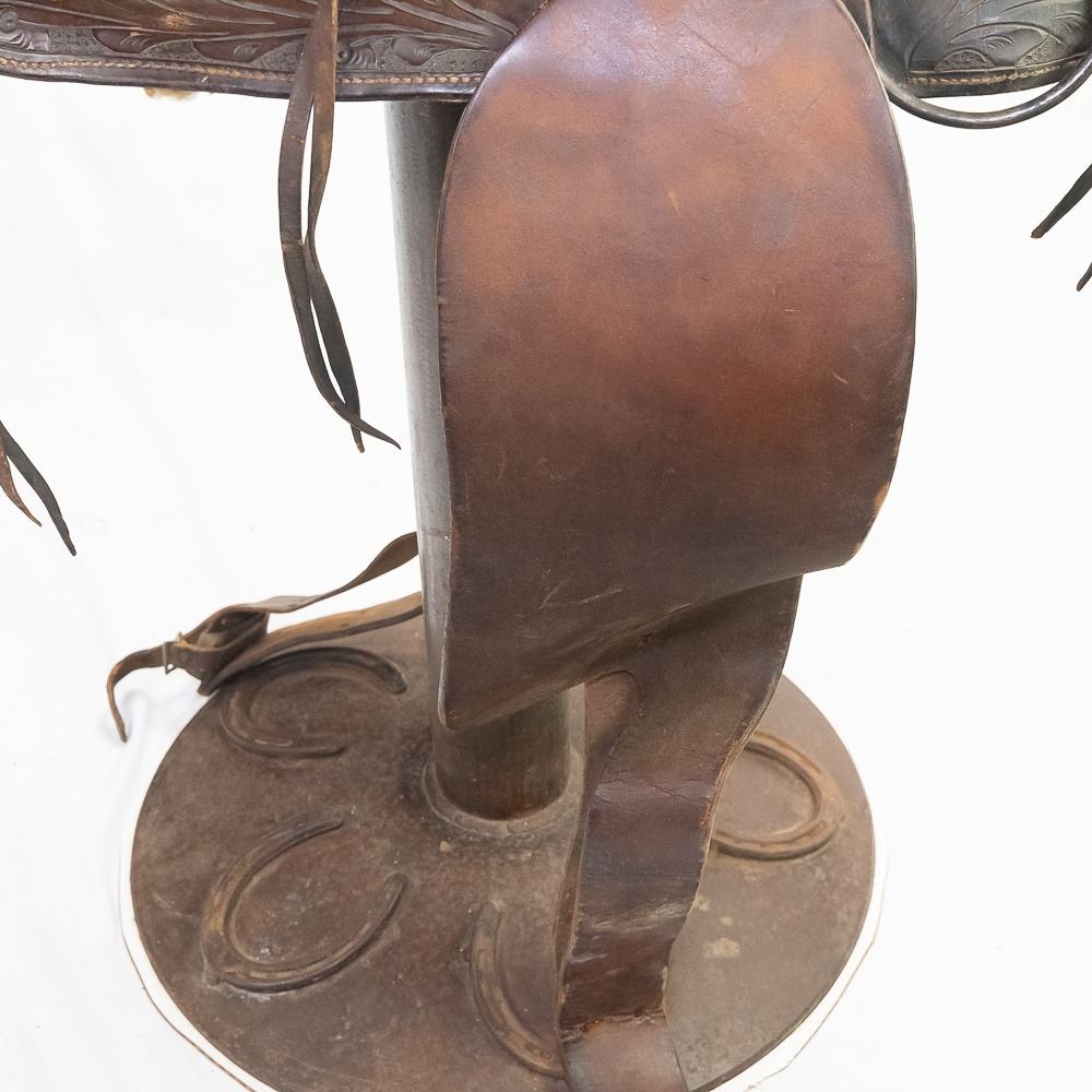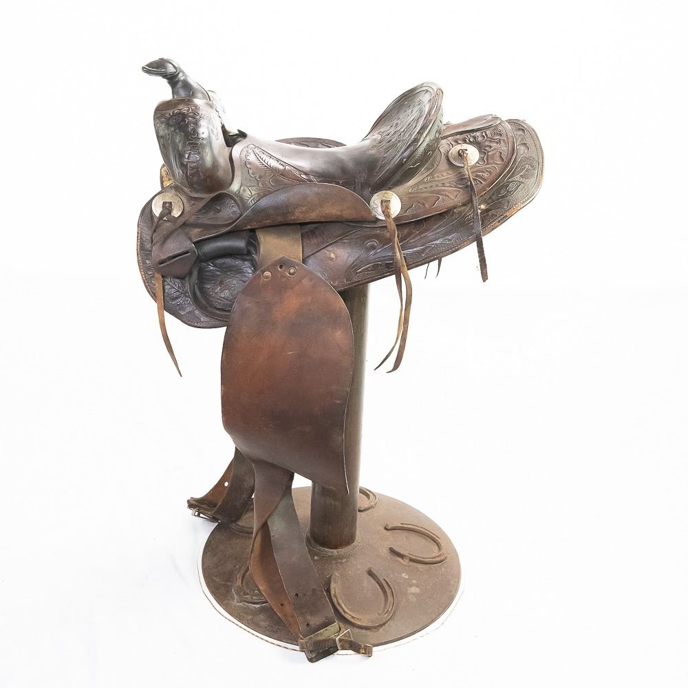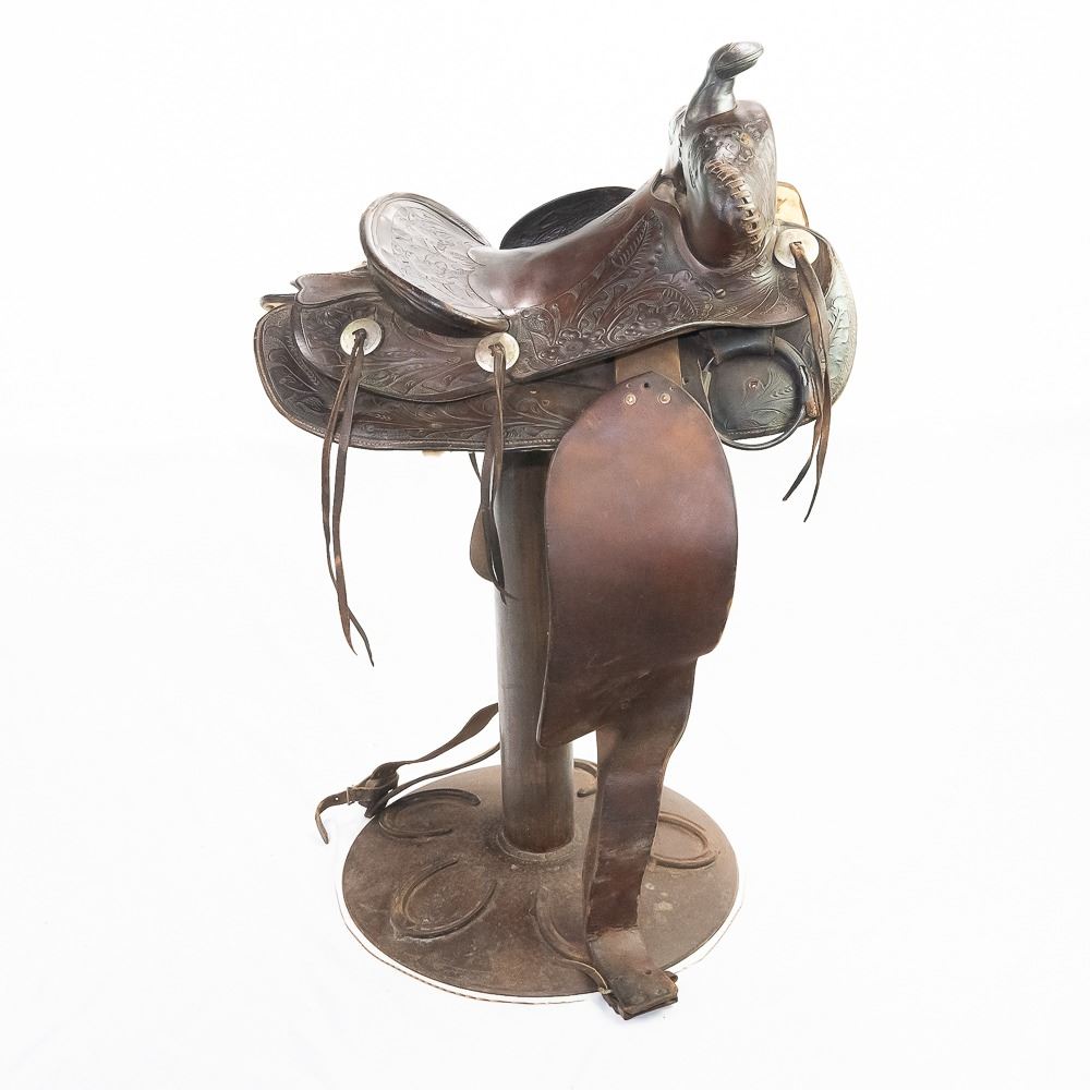 Complete, in overall good condition. Perfect for display or to make into a bar stool. Needs a good cleaning. 13" seat, saddle stand not included. See photos.