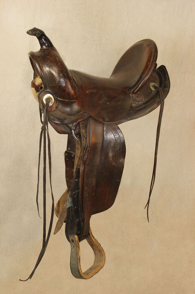 Interesting Wyoming ranch cowboy saddle with 14" seat, maker marked on both fenders, marked Valley Wyo #62 on the jockeys, and C/3 brand behind the cantle.