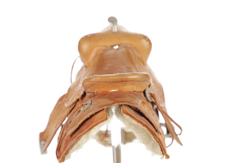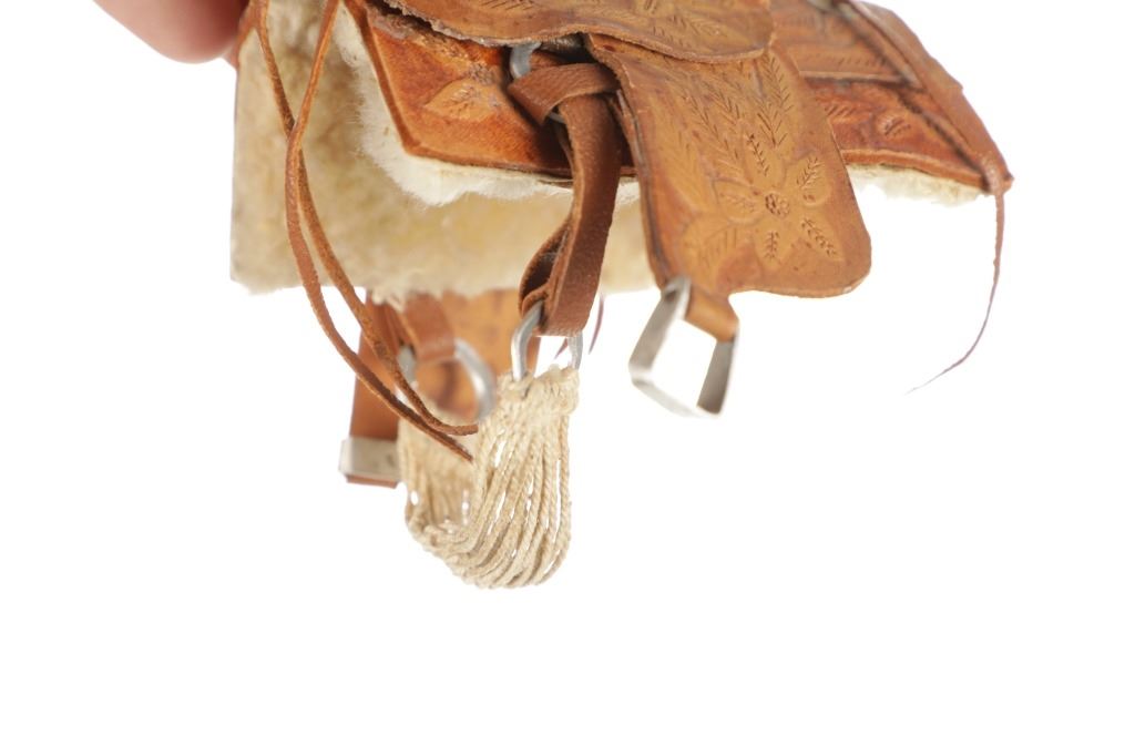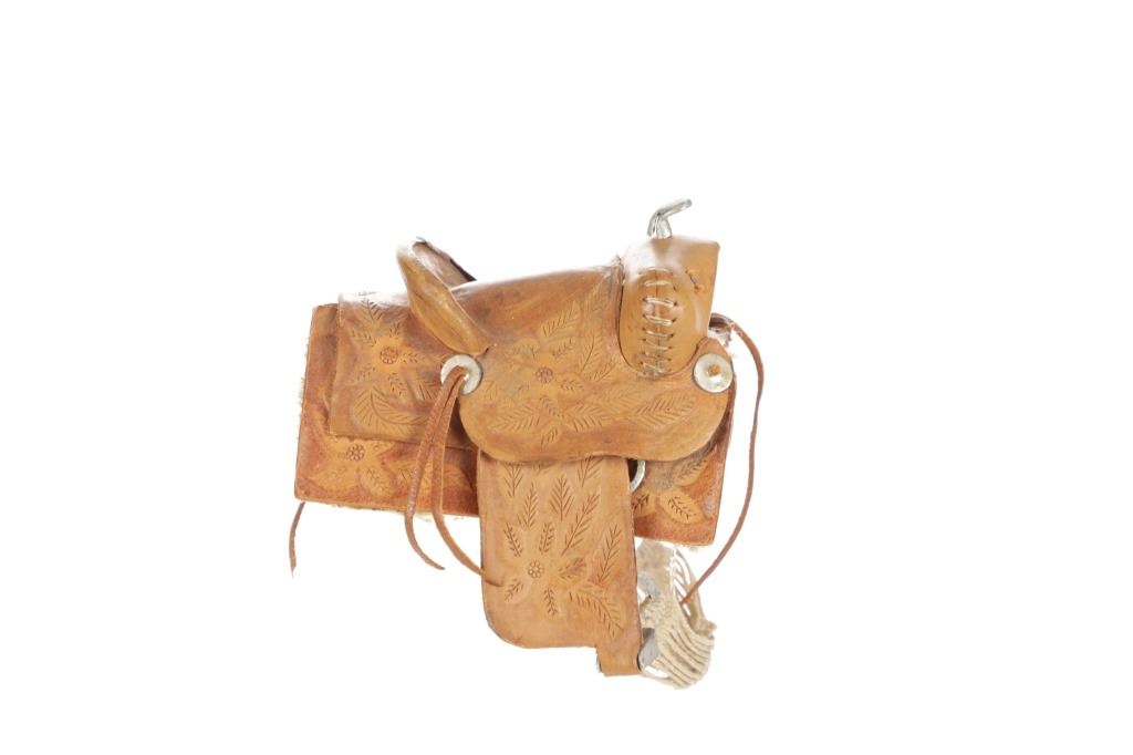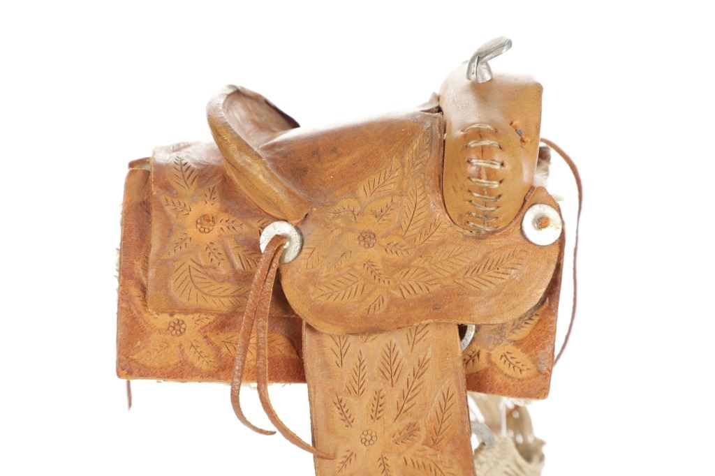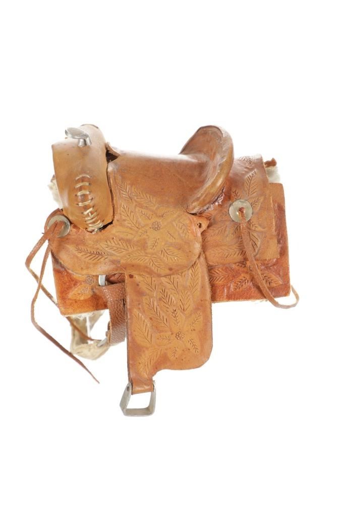 For your consideration is this Western Salesman Sample Saddle, circa 1900's. This original saddlery shop salesman sample surely dates to the mid 1900's. This sample saddle would have been used to show off the countless options a saddle maker can contribute to the right custom saddle. This saddle shows the type of harness the stirrups and latigo keepers are attached to. There is beautiful tooling to the fenders. This particular sample has had minor repairs and is missing a concho and latigos. The measurements of this sample saddle are 3 1/2" long x 2 1/2" wide x 4 1/4" fender to horn.