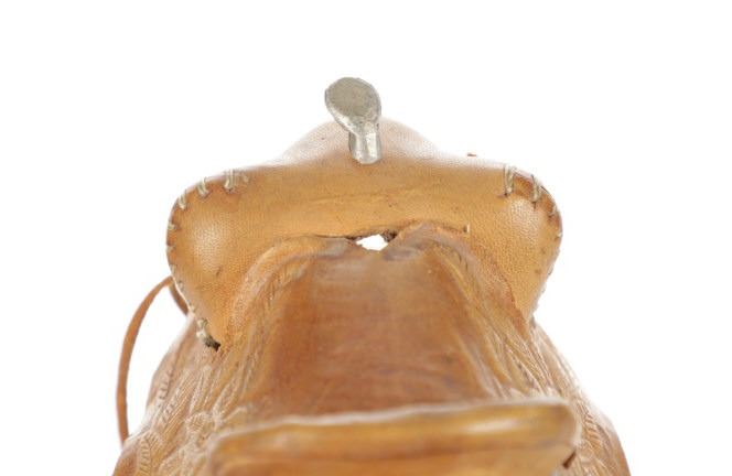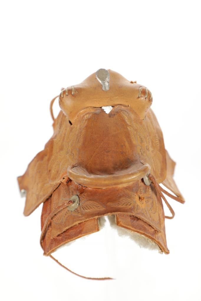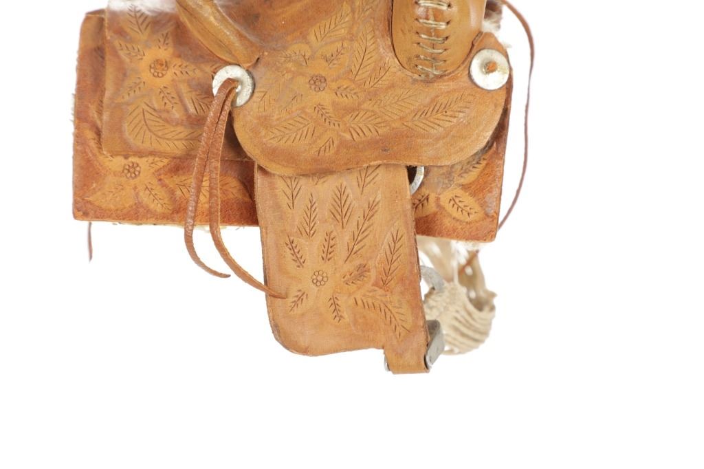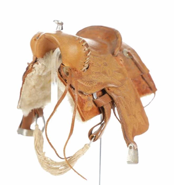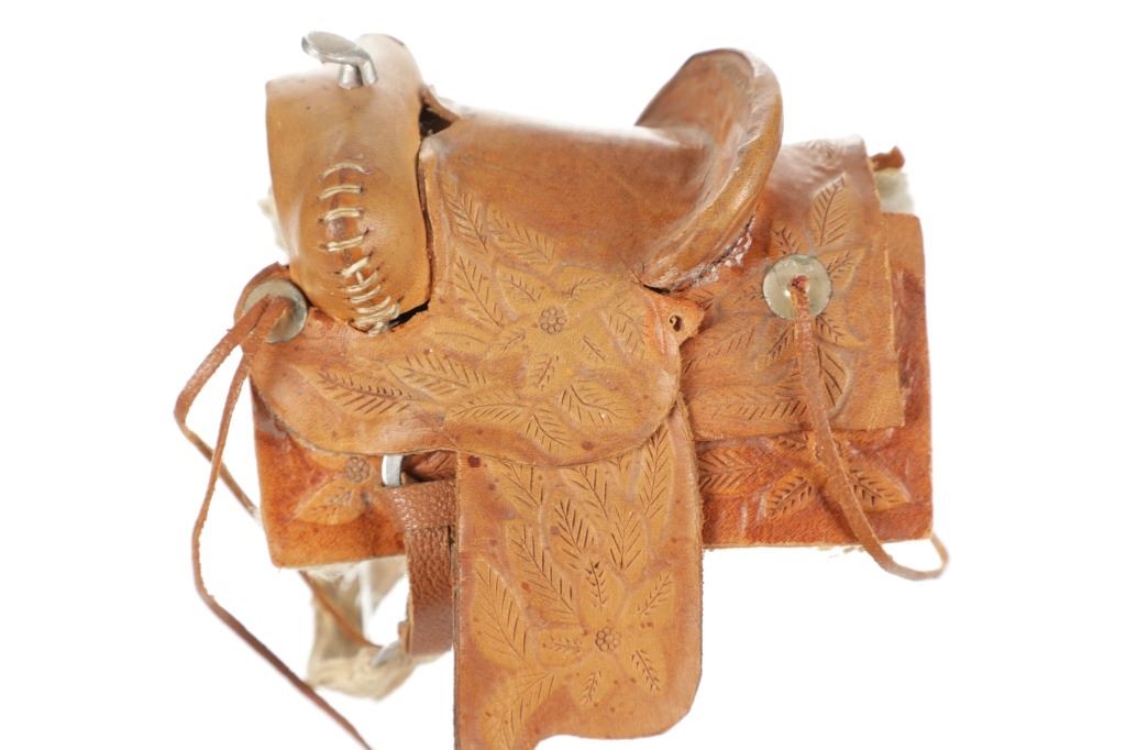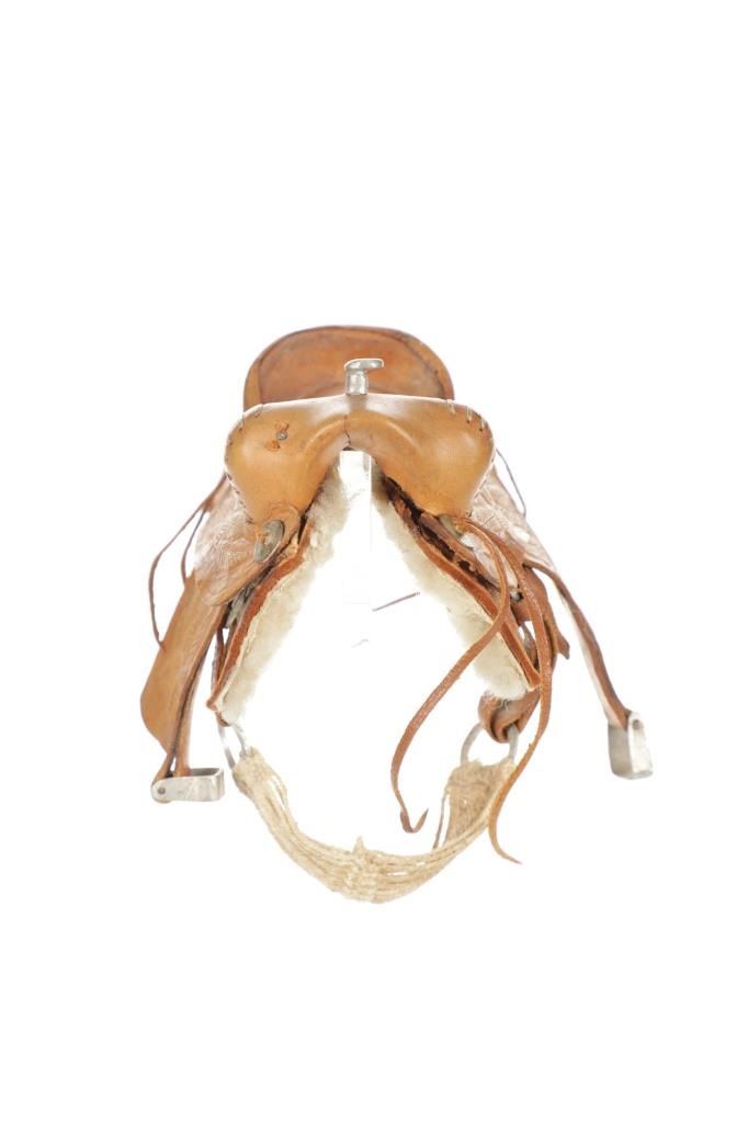 For your consideration is this Western Salesman Sample Saddle, circa 1900's. This original saddlery shop salesman sample surely dates to the mid 1900's. This sample saddle would have been used to show off the countless options a saddle maker can contribute to the right custom saddle. This saddle shows the type of harness the stirrups and latigo keepers are attached to. There is beautiful tooling to the fenders. This particular sample has had minor repairs and is missing a concho and latigos. The measurements of this sample saddle are 3 1/2" long x 2 1/2" wide x 4 1/4" fender to horn.