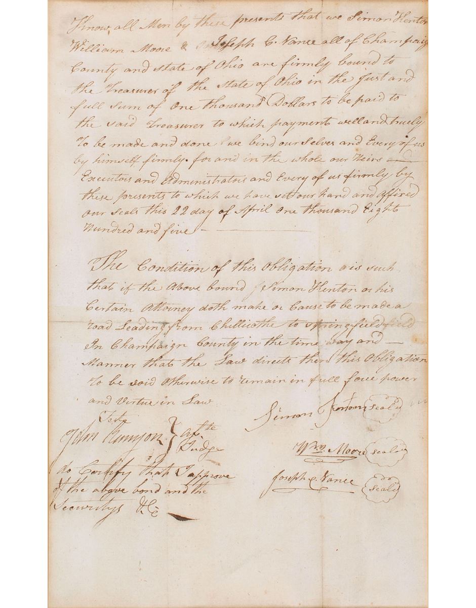 American frontiersman and soldier (1755–1836) who served in the Revolution, Northwest Indian War, and War of 1812, and once saved the life of Daniel Boone. Manuscript DS, signed “Simon Kenton,” one page, 7.25 x 11.75, April 22, 1805. A financial document concerning a loan. In part: “Know, all Men by these presents that we Simon Kenton, William Moore & Joseph C. Vance of Champaign County and state of Ohio are firmly bound to the Treasurer of the state of Ohio in the just and full sum of one thousand Dollars.” Signed at the conclusion by Kenton, Moore, and Vance. Double-matted with an engraved portrait to an overall size of 17 x 17. In very good condition, with separations to intersecting folds repaired on the reverse, and light toning and soiling.