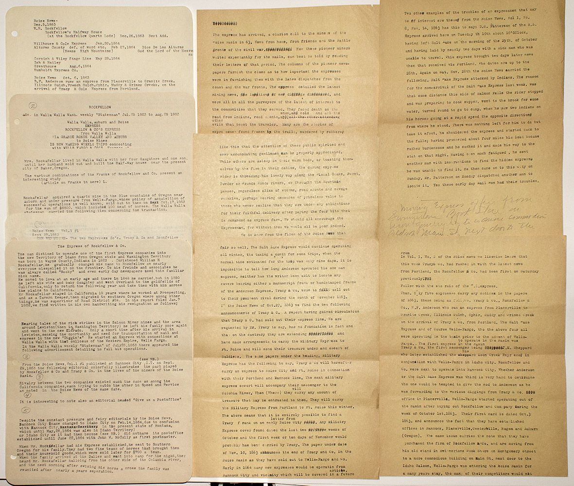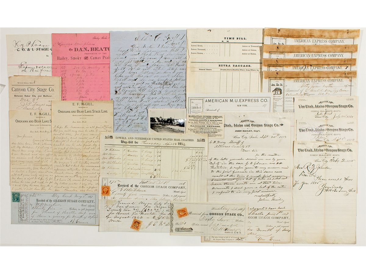 c1824 Very large lot (approx. 35 items) of Stage Coach Line ephemera and copies. Some are from other states and territories, such as Idaho and California. There are numerous receipts with revenue stamps from the "Oregon Stage Company" from 1897. There are Way Bills from "Loewell and Petersham United States Mail Coaches," "Moore`s Flat and Eureka Express," and from "Keene & Boston, United States Mail Coach," dated 1842. There are 3 notes and 2 letters from the "Office of The Utah, Idaho & Oregon Stage Co. John Hailey Sup`t." dated July of 1885. There are 5 American Express Co. Receipts, dated 1875. There 2 letters written on "Onekama and Bear Lake Stage Line" (E.F. McGill, Proprietor) stating "Good Livery in Connection" on their letterhead. There are several copies of Wells Fargo covers from Walla Walla and Placerville-Boise. There is a small photo of a stage coach as well. Finally, there are 2 multi-page letters, both from "The Express of Rockfellow & Co. dated 1862, and 1863 respectively. All documents are in very good to excellent condition. - HKA#65289
