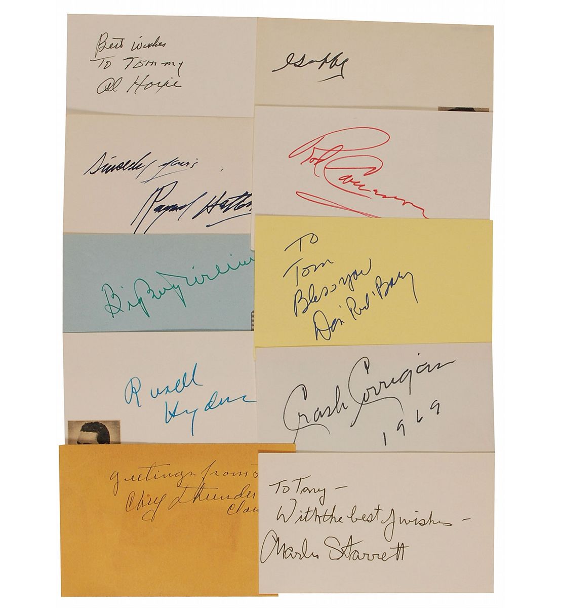 Ten ink and felt tip signatures of western stars on individual slips and cards. Signers are: Guinn ‘Big Boy’ Williams, Charles Starrett (ins), Chief Thundercloud, Ray ‘Crash’ Corrigan, Donald ‘Red’ Barry (ins), Gabby Hayes, Russell Hayden, Raymond Hatton, and Al Hoxie (ins). In overall fine condition.