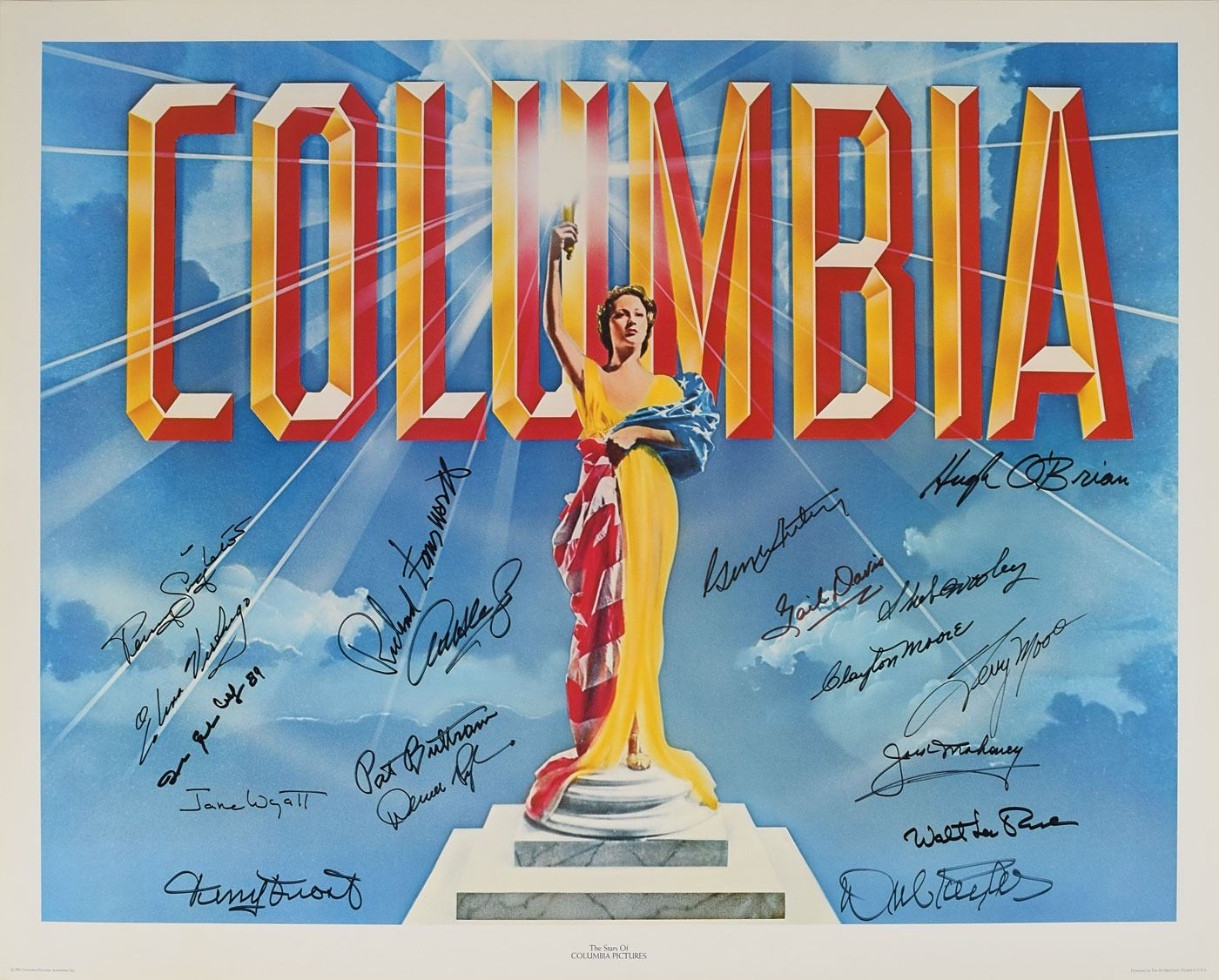 Color 30 x 24 poster entitled "The Stars of Columbia Pictures," showing the company's logo of a woman carrying a torch and wearing a drape, signed in black felt tip by Gene Autry, Terry Frost, Jane Wyatt, Gail Davis, Terry Moore, Clayton Moore, Walt LaRue, Sheb Wooley, Jock Mahoney, Penny Singleton, Richard Farnsworth, Pat Buttram, Elena Verdugo, Dub Taylor, Alan Hale, Jr., Iron Eyes Cody, and Denver Pyle. In fine condition.