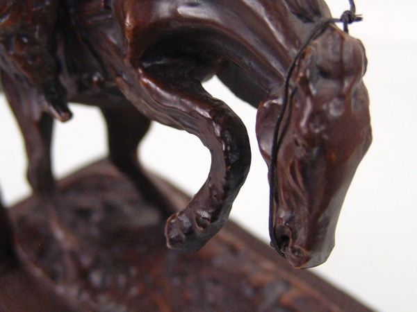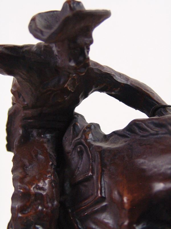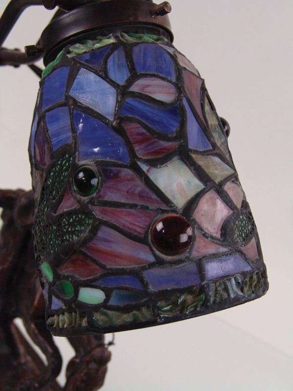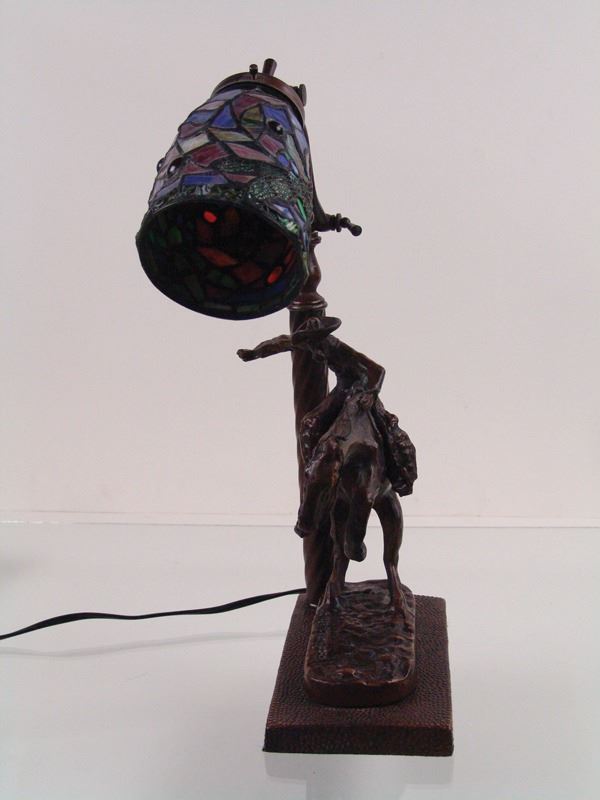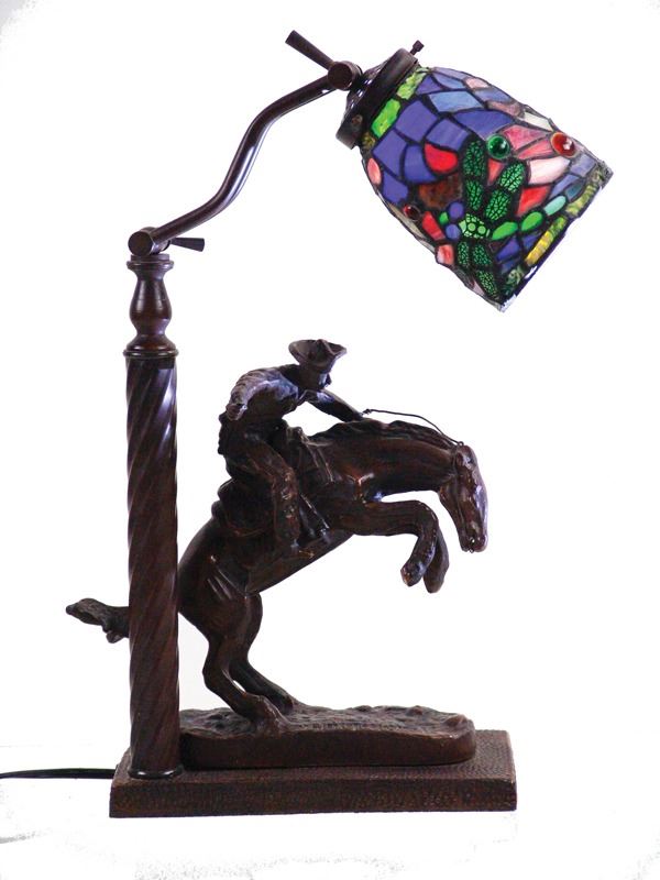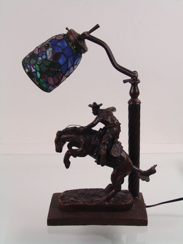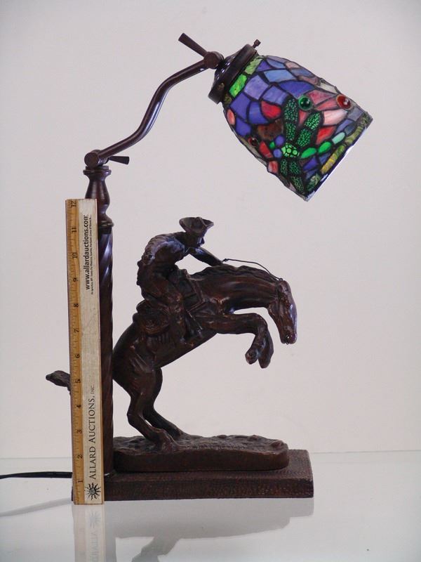 Mid/Late 1900s 14" "Let-Her-Buck" bronzette figurine of composite material with Tiffany style, stained glass shade. Very good condition.