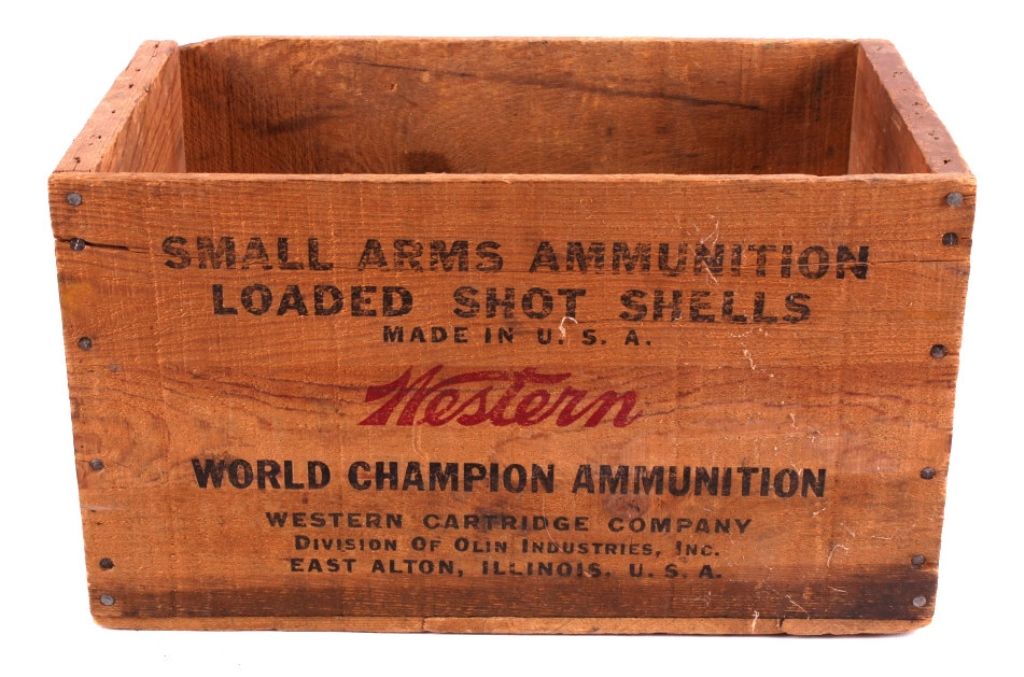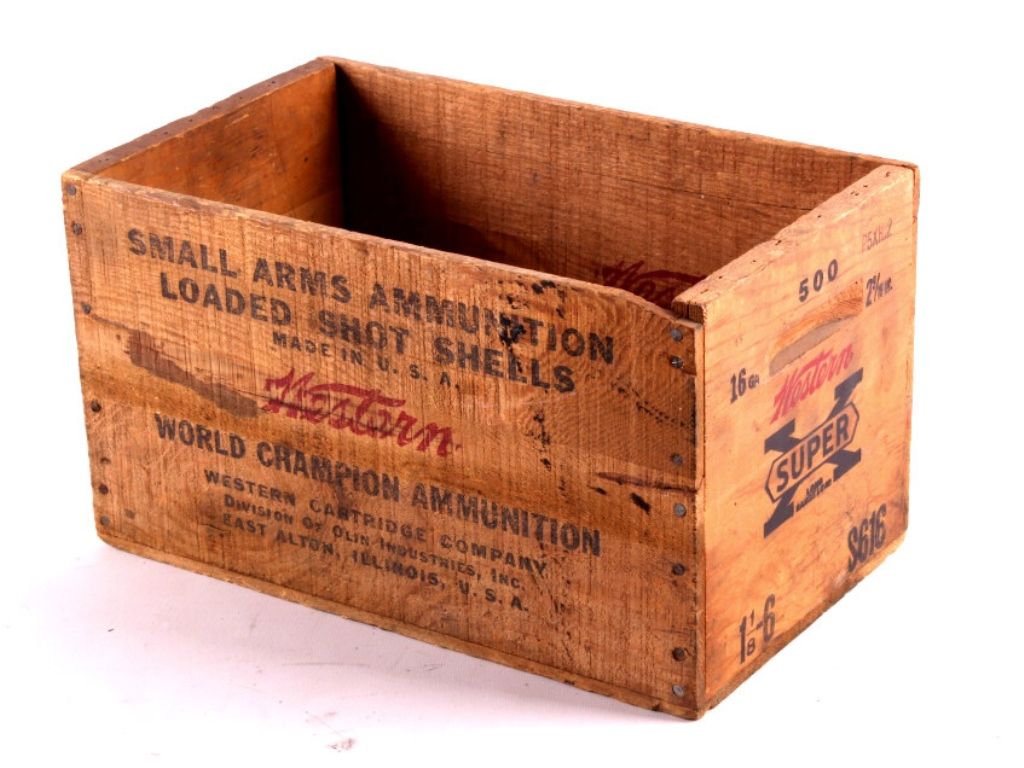 This is a wooden Western Super-X 16 gauge ammunition box. This box held 500 16 gauge shotgun rounds. The ammunition box is in good condition. It measures 8.5" x 14.25" and is 8.25" tall.