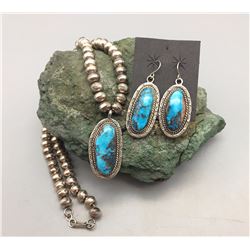 Description: A three-row bracelet and a two-row ring. Both are marked as sterling silver and both have faux turquoise.