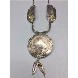 Description: A spiny oyster, cluster style, necklace (pendant) created by the Navajo artist, Roie Jaque. Marked as sterling silver.
