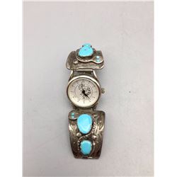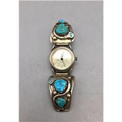 Description: Turquoise and sterling silver watch bracelet, on a stretchy watch band, featuring a snake design, created by Effie Calavaza. Tested as st
