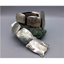 Description: Vintage Concho belt. Conchos are nickel silver, not sterling silver. Has a good look to it, on a black leather belt.