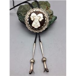 Description: Vintage Zuni inlay bolo tie featuring a horse design. Cord is braided black leather with matching sterling silver tips.