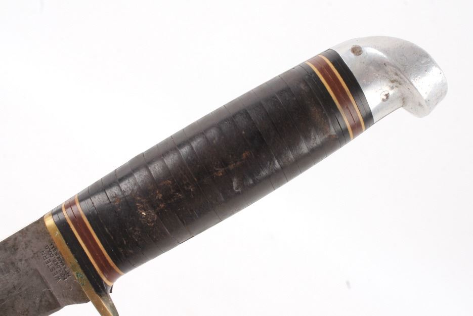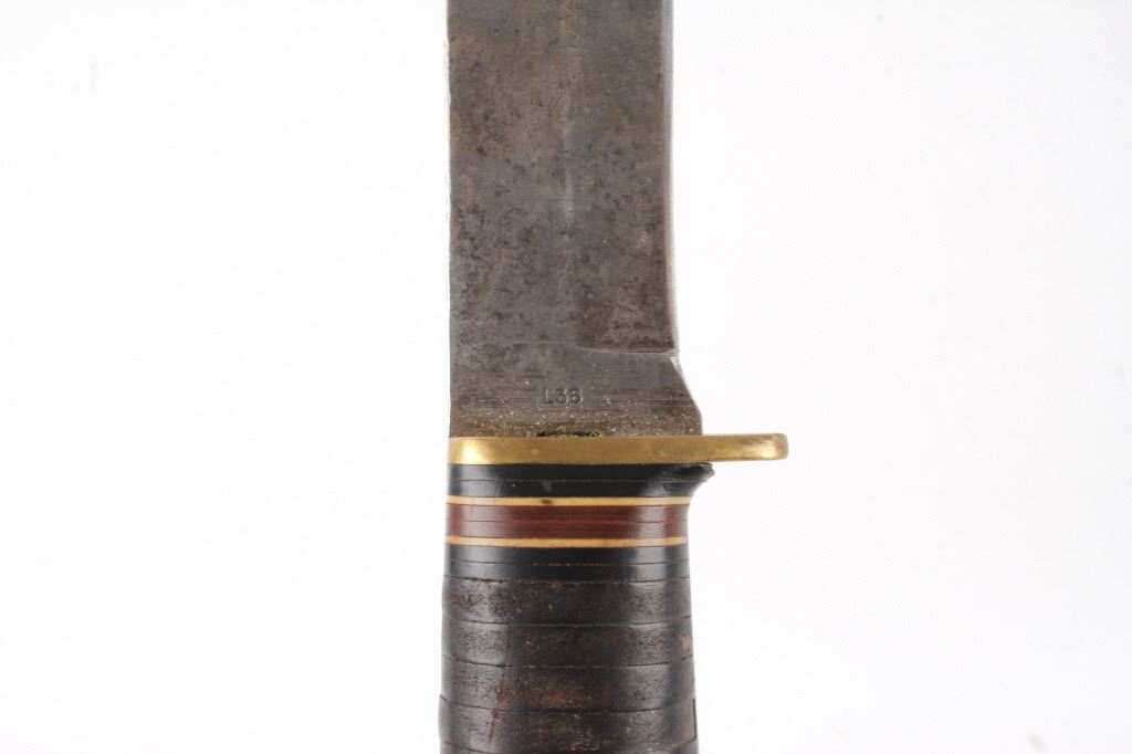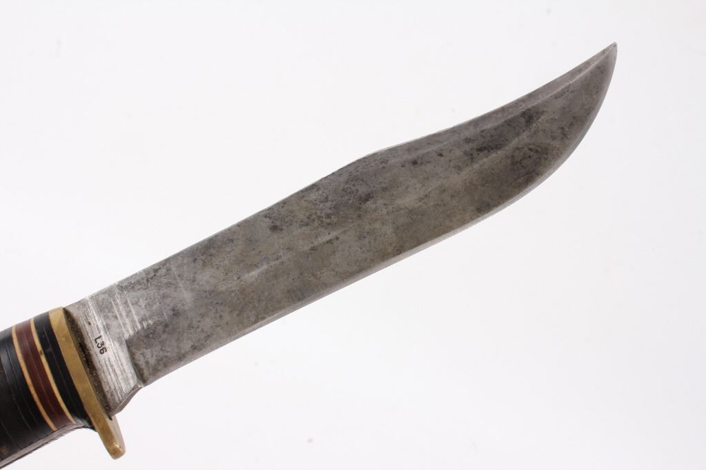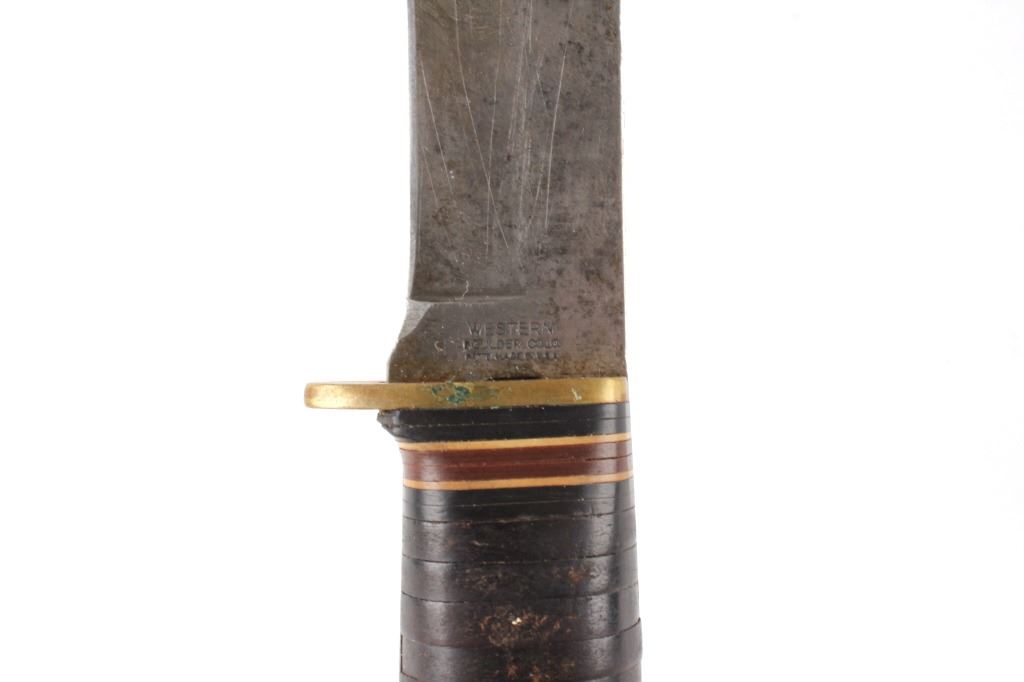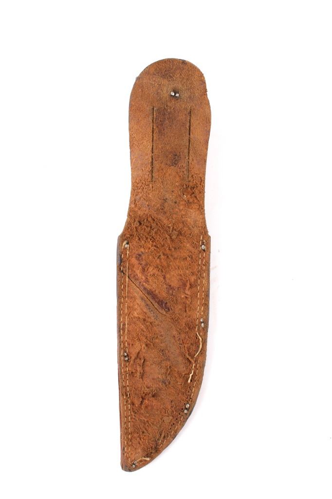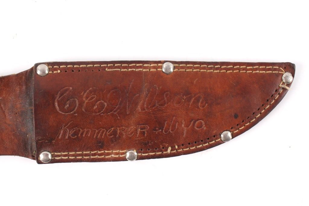 For your consideration is this early 1900's hunting knife with leather wrapped handle and slightly curved blade from Western U.S.A. The Western Knife Company was a manufacturer of hunting knives which began operations in Boulder, Colorado in 1911. The company is probably best known for its "Bowie" style hunting knives. The company was purchased by Coleman (the famous manufacturer of outdoor equipment) in 1984. The condition of this blade is good showing a slight oxidized patina to the blade consistent with its age and very little wear to the handle of the knife; the sheath was made for this knife specifically and is in good condition with stamping from previous owner "C.E. Wilson Kemmerer, Wya". The measurements of this knife are 9 3/4" x 1 1/2" and the blade length is 5 1/2".