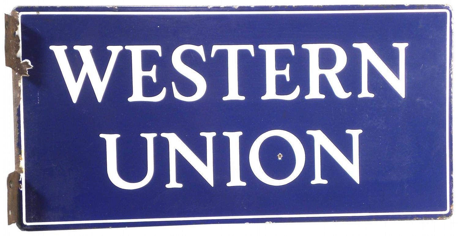 Western Union Porcelain Sign. Couple of small chips on both sides and rust on the bracket otherwise very good condition. 24 X 12 inches.