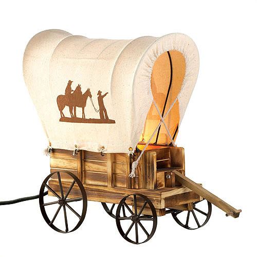 Western Wagon Table Lamp **|**|** Follow the wagon trail to discover the most charming lamp on the prairie. This tabletop wooden wagon lamp features metal wheels and a wagon cover with silhouettes of cowboys and horses. Item weight: 2.4 lbs. 12 x 6-1/4" x 13-3/8" high. Wood and iron."