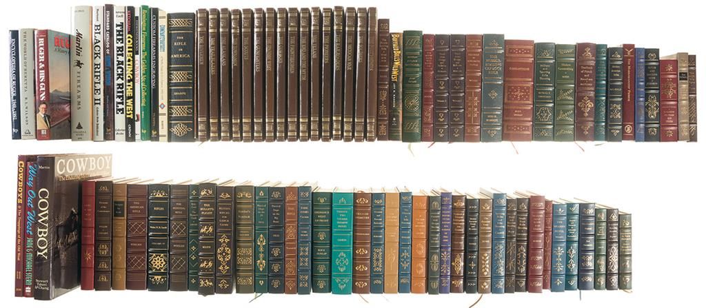 Large lot of 89 western and firearms related books, most are leather bound unless otherwise noted. Titles and authors to include: Time Life series, The Old West (16 hardback books w/one paperback Master Reference Index). Buffalo Bill's Wild West, hardback by Kasson. Company Property, softback by Bartz. Collecting the West, hardback by Ketchum. Way Out West, hardback by Stern. Cowboy, hardback by Knopf. Cowboys and Trappings of the Old West, hardback by Manns & Flood. Cowboy, The Enduring Myth of the Wild West, hardback by Martin. The World of Beretta, An International Legend, hardback by Wilson. Standard Catalog of Smith and Wesson, hardback by Supica and Nahas. The Black Rifle, hardback by Stevens and Ezell. Black Rifle II, hardback by Bartocci. Hatcher's Notebook by Hatcher. Deane's Manual of the History of Firearms by Deane. Triggernometry by Cunningham. Firearms & Ballistics by Burrard, Textbook of Firearms Investigation, Identification and Evidence by Hatcher. Small Arms Design and Ballistics Vol. II by Whelen. Small Arms Design and Ballistics Vol 1 by Whelen. Practical Dope on the 22 by Ness. Rifle Craft the Shooter's Guide by Landis. Instructions to Young Marksmen and How I became a Crackshot by Chapman and Farrow. Rifles and Rifle Shooting by Askins. Pistol and Revolver Shooting by Himmelwright. The Art of Handgun Shooting by Askins. Marksmanship Primer by Casada. Military and Sporting Rifle Shooting by Crossman. Ultimate in Rifle Precision by Whelen. Excellent to near new.