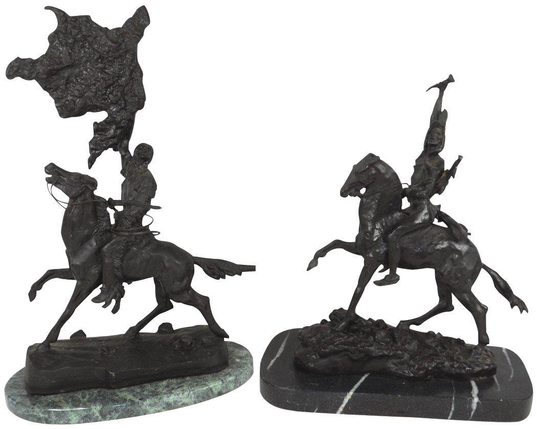 Western bronze statues on marble bases (2), Fighting Indian & Indian w/buffalo hide, c.1950's-1960's