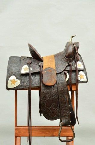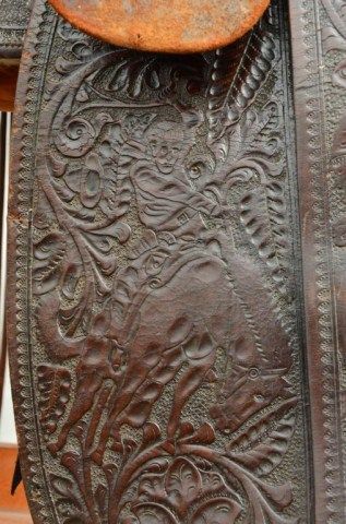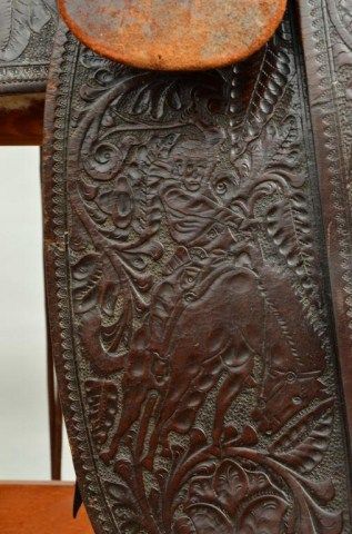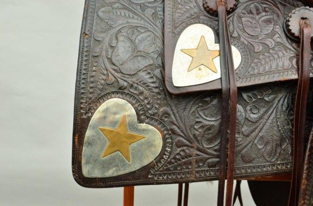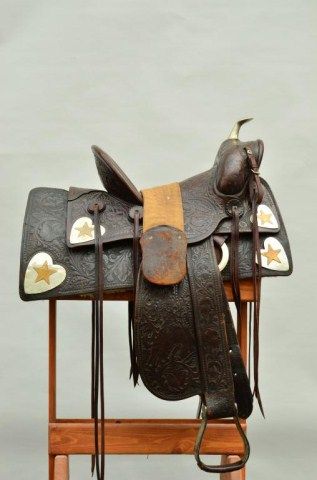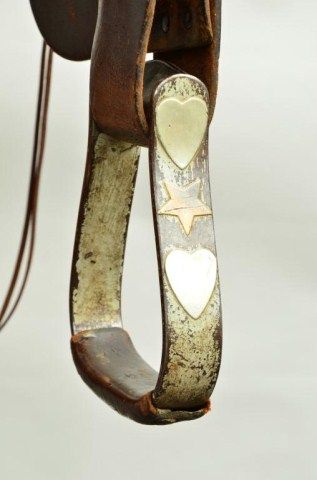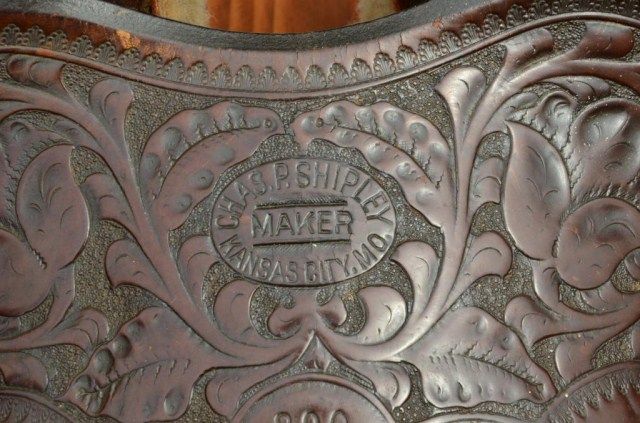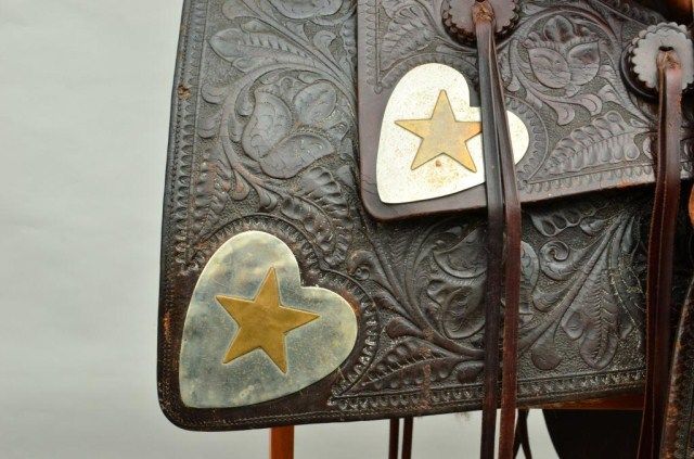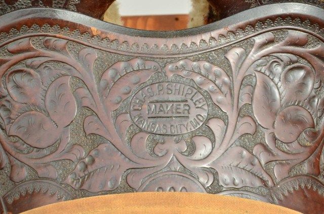 Western high back saddle marked Charles P. Shipley, Maker, Kansas City, MO. #290 with fancy tooling, large German silver heart decorations with stars belonging to Western Movie Star and rodeo legend Tom Mix. Anotarized affidavit executed in 1998 by Guillermo Martin, notary public, states that Ms. Maria Amalia Malcolm signed the document which states that she sold a Mexican saddle with gold and silver trim, trademark “SHIPLES (sic) Kansas City #290” to Noel Ymelt and that her father Juan August Malcolm obtained the saddle on a trip to the United States which used to belong to Tom Mix. By family legend, Juan Malcolm performed in rodeosthroughout South America and the United States where they became acquainted. Tom Mix was presented a great pair of silver and gold spurs for winning a roping competition in Argentina which we sold to Chris Anderson inthe 1970’s. This saddle was found in South America by noted firearms dealer Hans Schemke who has brokered the most historic Western artifacts found in the last 50 years south of the border. Little John’s is familiar with