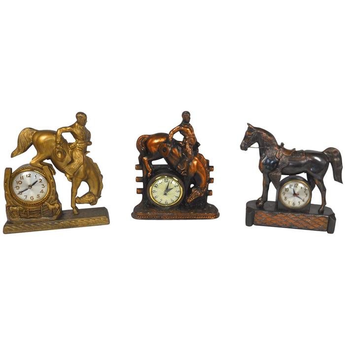 Western horse clocks (3), all metal, all different, one missing set knobs, o/wise all VG untested co
