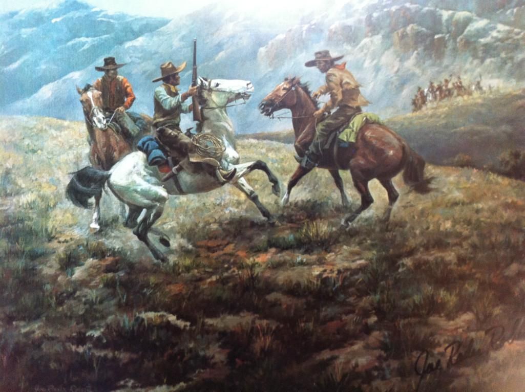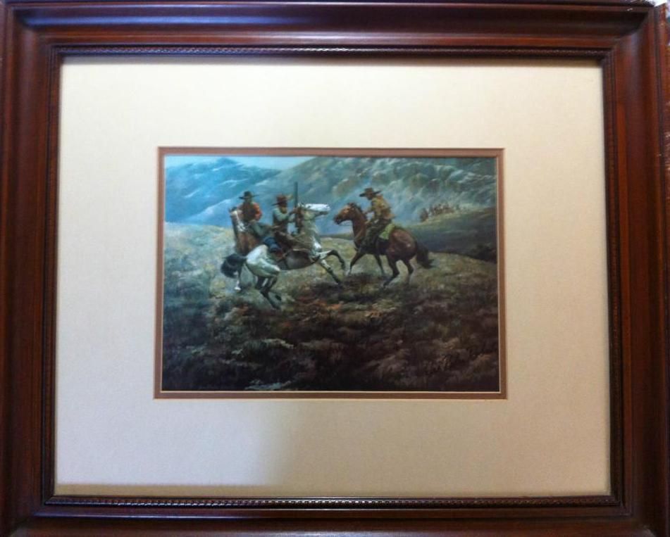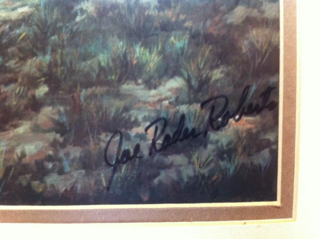 Framed Print 24" x 20" Printed Signature, and Artist Joe Radar Roberts signature Actual print size: 12" x 9" Joe Rader Roberts (1925-1982) Joe Rader Roberts was born in Lockhart, Texas. In high school his art abilities matured and he quickly found work after graduation as a commercial artist. After serving in the Merchant Marines from 1943-1945 he enrolled in the California School of Fine Arts in San Francisco. In 1949 he married and moved to Houston again, working as a commercial artist painting illustrations on store fronts various businesses. His passion for the historic frontier drew him to the fine arts and he became a full time artist painting scenes of the early West. Roberts was best known for his western narrative paintings and has collectors primarily throughout the southwest. Following in his footsteps, his son, Gary Lynn Roberts, is a noted Western artist.