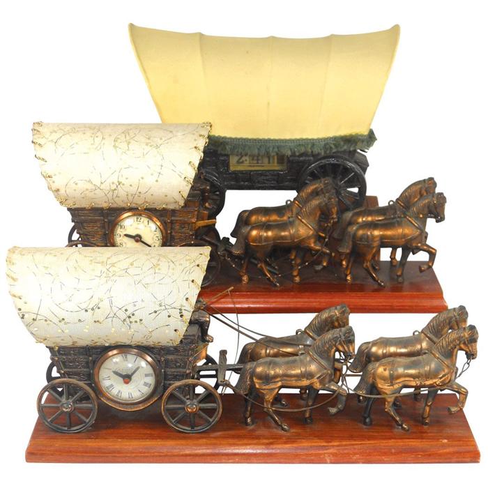 Western stagecoach radio & clocks (3), all cast metal in VG untested cond, 14" & 21"L.