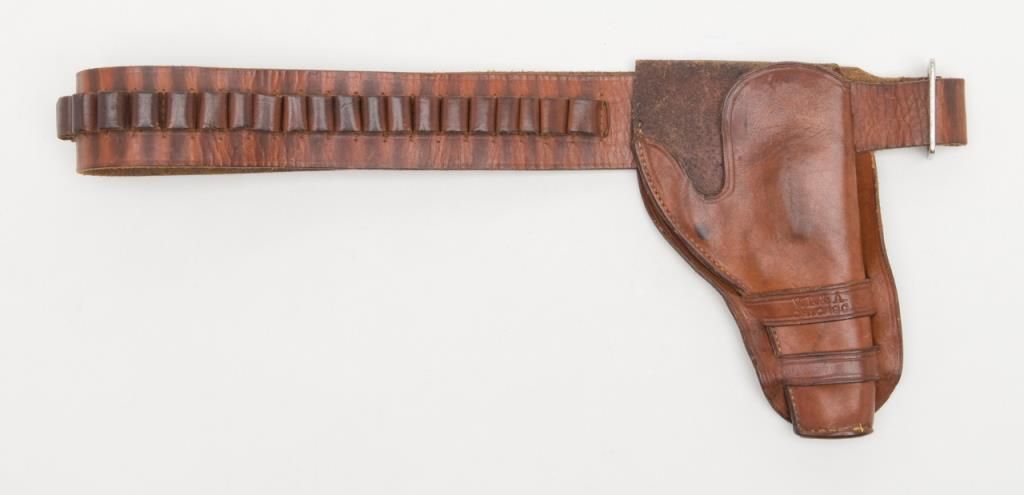 Western style double loop holster for a 4” large frame DA revolver marked V.L and A, Chicago, circa 1920’s-30’s. Von Lengerke and Antoine were premier arms dealers at the time of the Valentine’s Day Massacre; cartridge loops for.44’s; very good + condition. Est.: $350-$700.